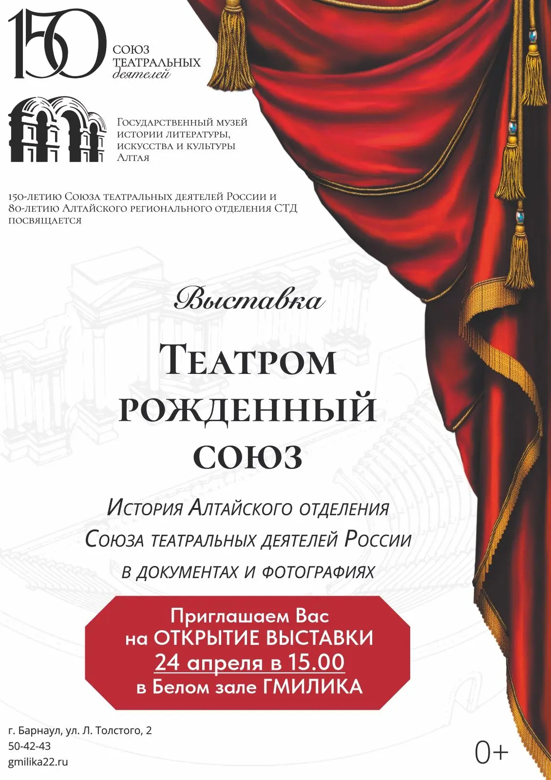 24 апреля в 15.00 в Государственном музее истории литературы, искусства и культуры Алтая состоится открытие выставки «Театром рождённый союз», посвященной 150-летию Союза театральных деятелей Российской Федерации и 80-летию Алтайского регионального отделения СТД.