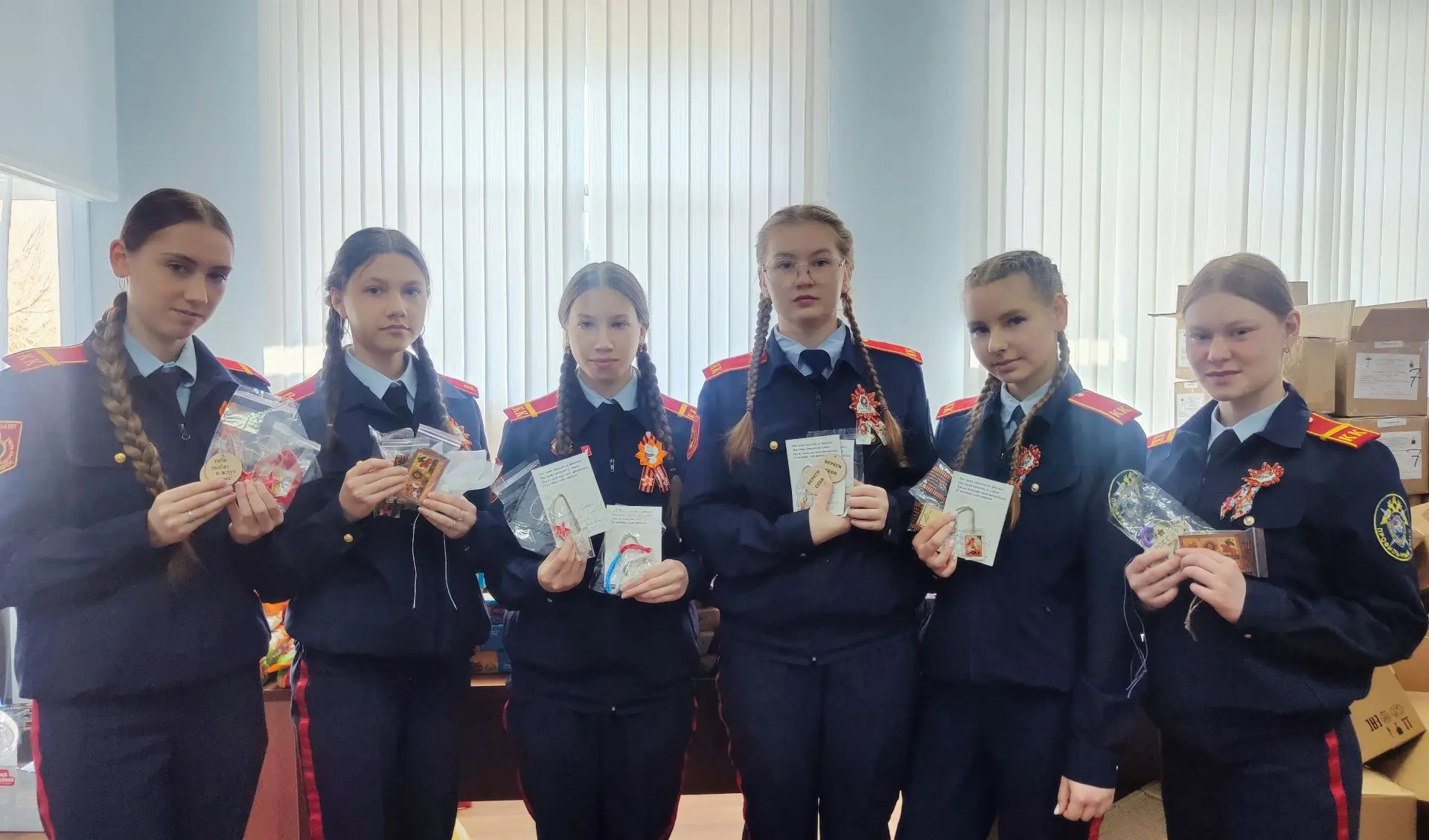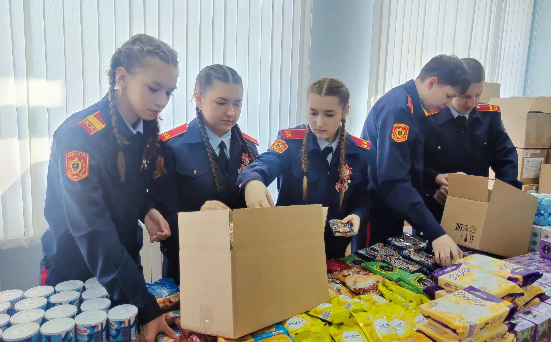 Особый вклад в подготовку груза внесли кадеты Барнаульского кадетского корпуса, состоящие в волонтёрском отряде «Наша эра». Ребята не только помогали формировать наборы, но и вложили в них письма со словами поддержки, а также изготовленные своими руками обереги. Помимо этого, кадеты систематически заняты плетением маскировочных сетей и изготовлением окопных свечей.