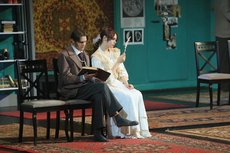 В Молодежном театре Алтая вечер начался со спектакля "Имени революции" — первой постановки, которую показали в этих стенах. После просмотра для гостей провели экскурсию по театру.