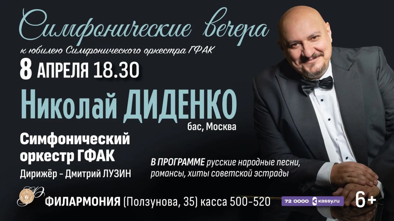 Николай Диденко выступит вместе с симфоническим оркестром филармонии под управлением маэстро Дмитрия Лузина. В программе прозвучат русские народные песни, романсы, хиты советской эстрады, арии из опер.