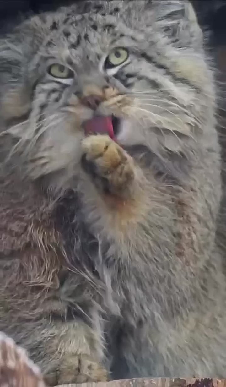 Красавчик манул Шу умывается. Никак на свидание с Пепе собрался
