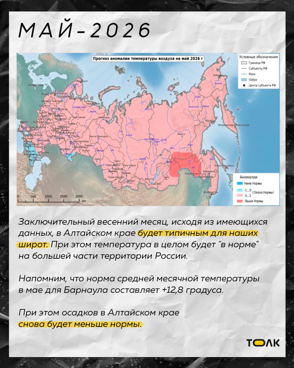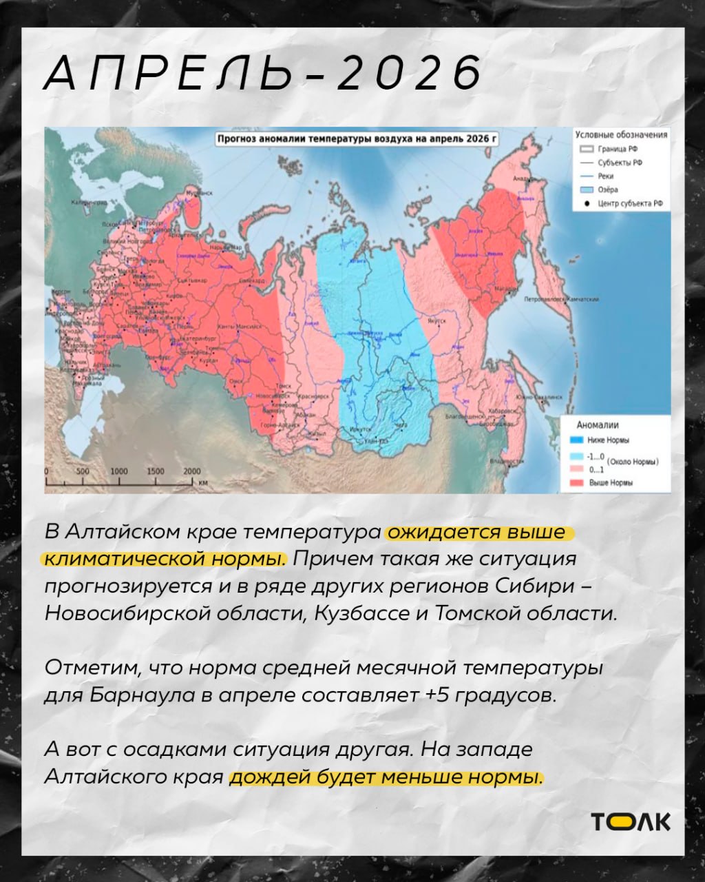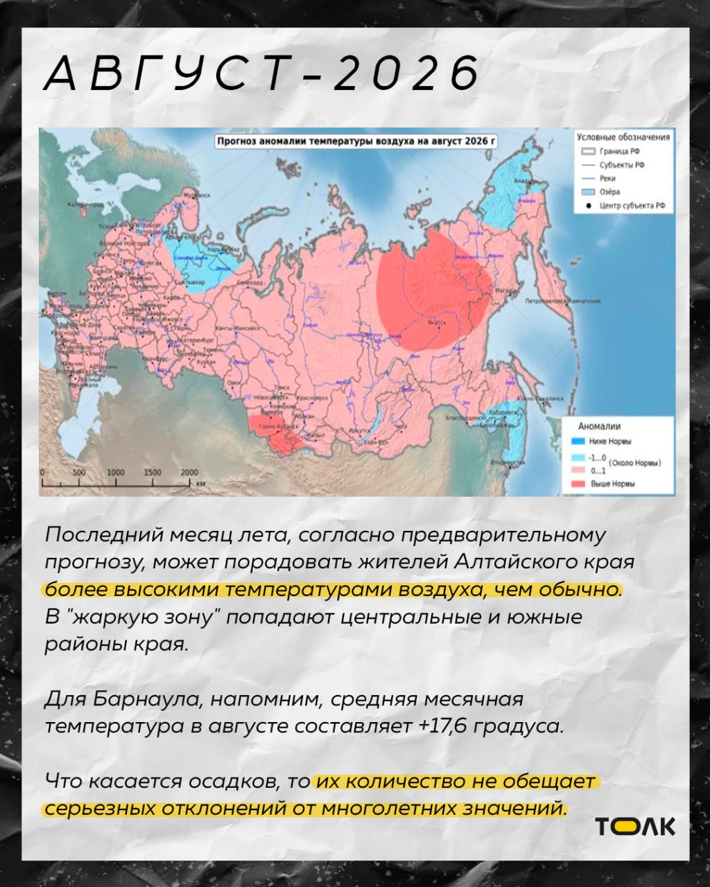 По данным синоптиков, в отдельные месяцы на территории Алтайского края температура будет превышать средние многолетние показатели. Подробнее о погоде в карточках.