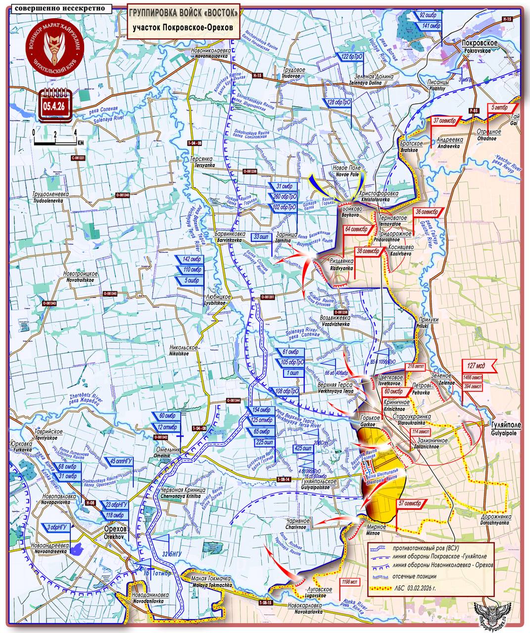 Напряженная обстановка также на восточном участке Запорожского направления. На правом фланге, на стыке с южным участком Днепропетровского направления 1 апреля был освобожден н.п. Бойковка. Это важный плацдарм для флангового охвата Покровского района и выхода в предполье Верхнетерской линии обороны ВСУ.