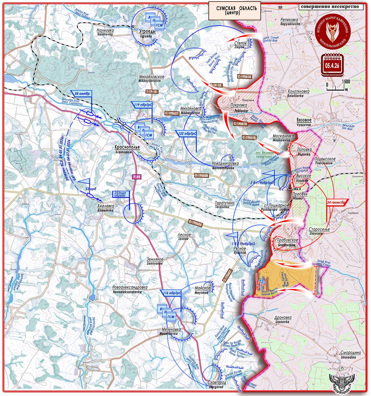 На центральном участке Сумского направления после активных действий на правом фланге (район Покровское) подразделения группировки «Север» продвинулись на левом фланге (южнее н.п. Грабовское) на расстояние около 3 километров и вышли на рубеж реки Корова, направлением в стык участков обороны ВСУ Высокое -Рясное и Майское - Мезенковка - Славгород. За рекой рокада О-190607, обеспечивающая взаимодействие этих участков.