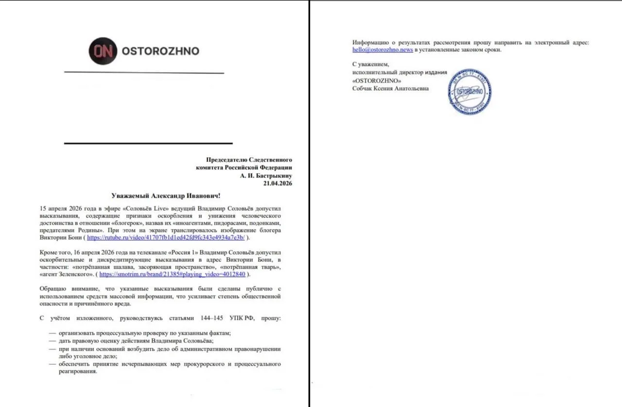 Заявление написано на имя главы СК Александра Бастрыкина. Собчак просит дать правовую оценку действиям Соловьева и, при наличии оснований, возбудить административное или уголовное дело.