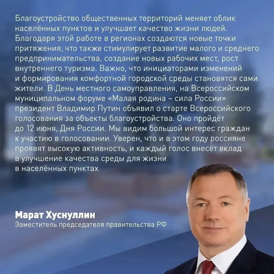 С 21 апреля по 12 июня проходит Всероссийское голосование за объекты благоустройства. Это шанс выбрать, какие парки, скверы и общественные пространства обновят в 2027 году в рамках нацпроекта «Инфраструктура для жизни».