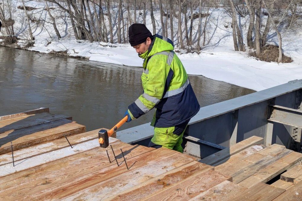 Длина моста составляет 104 метра, ширина - 6,5 метров. На буроналивные сваи установлено металлическое основание, закрытое деревянным настилом. Работы начались в конце прошлого года, их стоимость составляет 49 млн рублей. На объекте работает семь человек.