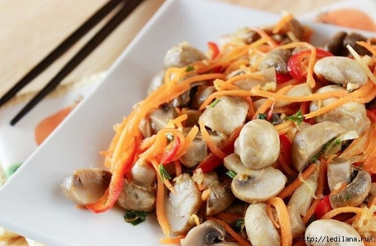 Заполните трёхлитровую кастрюлю водой и поставьте её на средний огонь. Когда вода закипит, добавьте немного соли и опустите шампиньоны.Варите грибы в кипятке 5 минут. Затем переложите их в дуршлаг и дайте остыть.Тем временем нарежьте лук полукольцами и обжарьте до золотистой корочки на растительном масле.Болгарский перец нарежьте тонкими полосками. В глубокую чашу для маринования поместите охлаждённые грибочки и нарезанный перец.Продавите чеснок через пресс или натрите на мелкой терке.Добавьте к грибам обжаренный лук и все специи: черный и красный молотый перец, паприку и кориандр.Влейте 2 ч.л. уксусной эссенции, тщательно перемешайте и попробуйте. При необходимости добавьте еще уксуса или специй по вкусу.Убедившись, что всё в порядке, дайте мариноваться 2-3 часа.Шампиньоны по-корейски готовы к подаче!