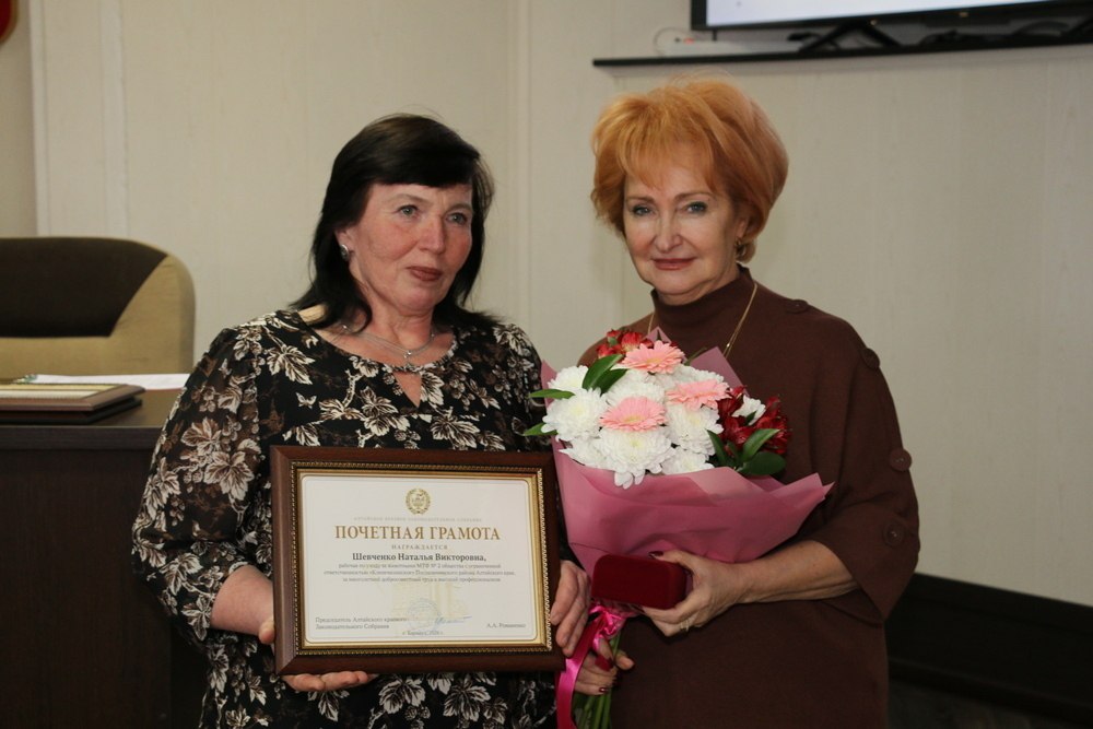 Председатель комитета АКЗС по соцзащите и занятости населения вручила награды краевого парламента и профильного комитета заслуженным жителям Поспелихинского района, в том числе активным участникам волонтерского движения.