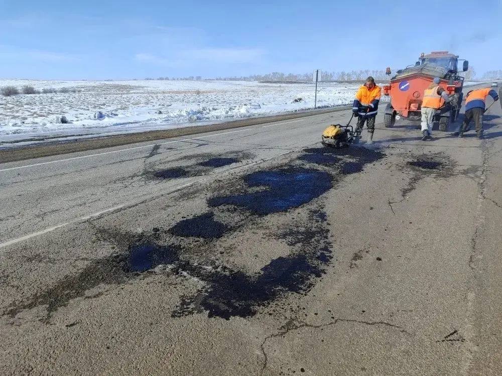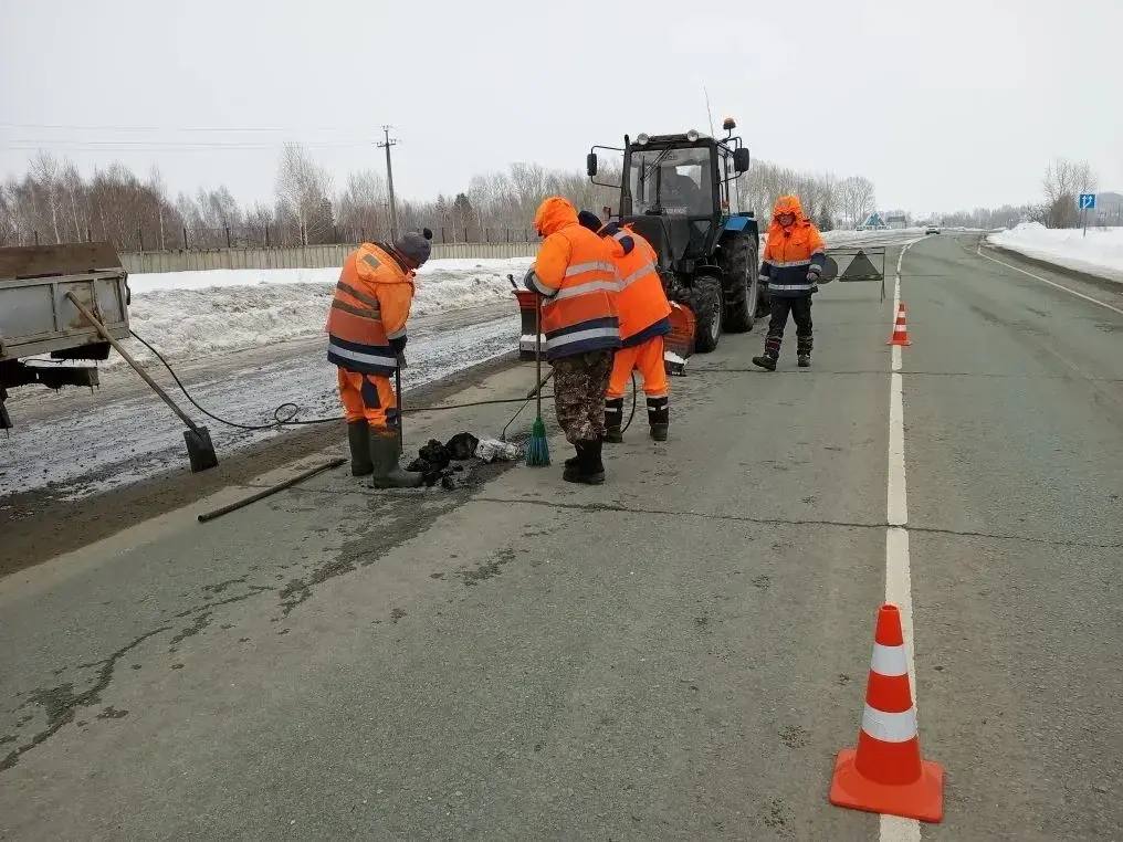 После завершения зимнего сезона дорожные службы приступили к ямочному ремонту, используя холодную асфальтобетонную смесь, позволяющую проводить работы даже при низких температурах.