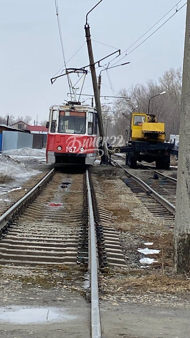 На фото видно, что столб наклонился и задел вагон электротранспорта. На месте работают специалисты.