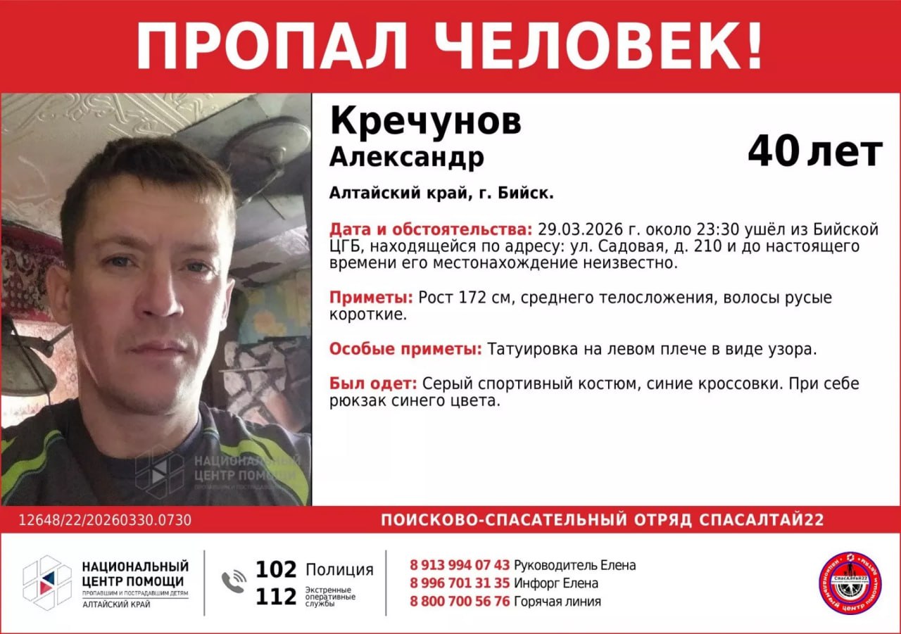 29 марта около 23:30 Александр Кречунов ушёл из Бийской ЦГБ, находящейся по адресу ул. Садовая, д. 210, и до настоящего времени его местонахождение неизвестно.