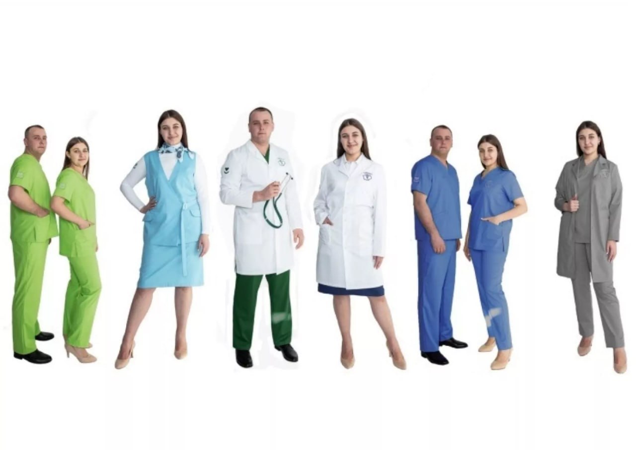 В детских поликлиниках - зеленый цвет формы, а для среднего медперсонала – салатовый. Во взрослых - темно-синий цвет для врачей, средний медперсонал – светло-синий. Младший медперсонал в обоих видах учреждений облачат в форму серого цвета, регистраторов – в форму с преобладающим голубым. Сотрудников скорой медицинской помощи – в коричнево-красные костюмы.