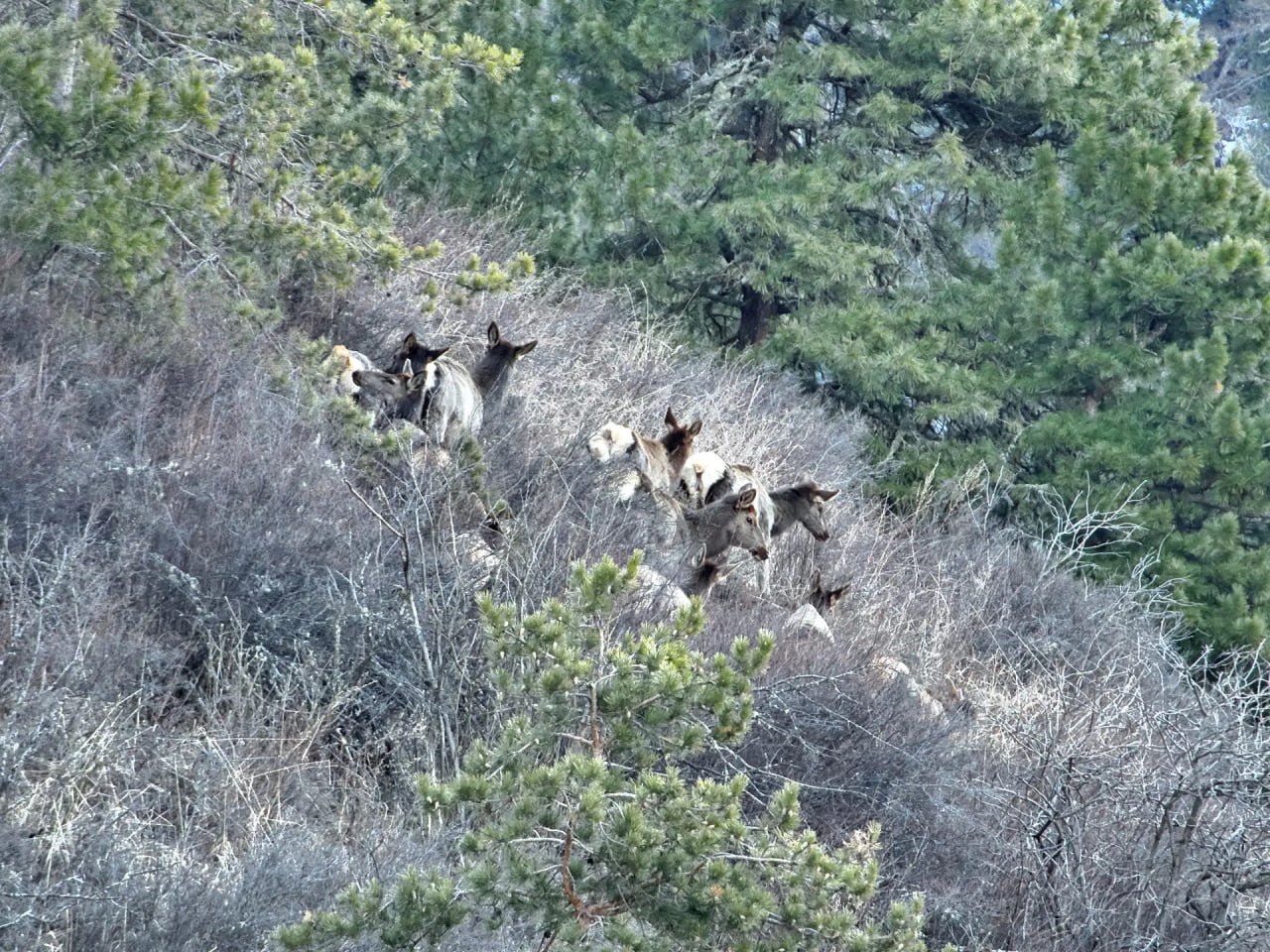 Внутри растительной мешанины из сухой прошлогодней травы и кустарника стоит куча маралов. Они сбились в плотную группу, и их очень трудно разглядеть - то голова мелькнёт, то спина, то нога. Кто-то вообще почти невидим.