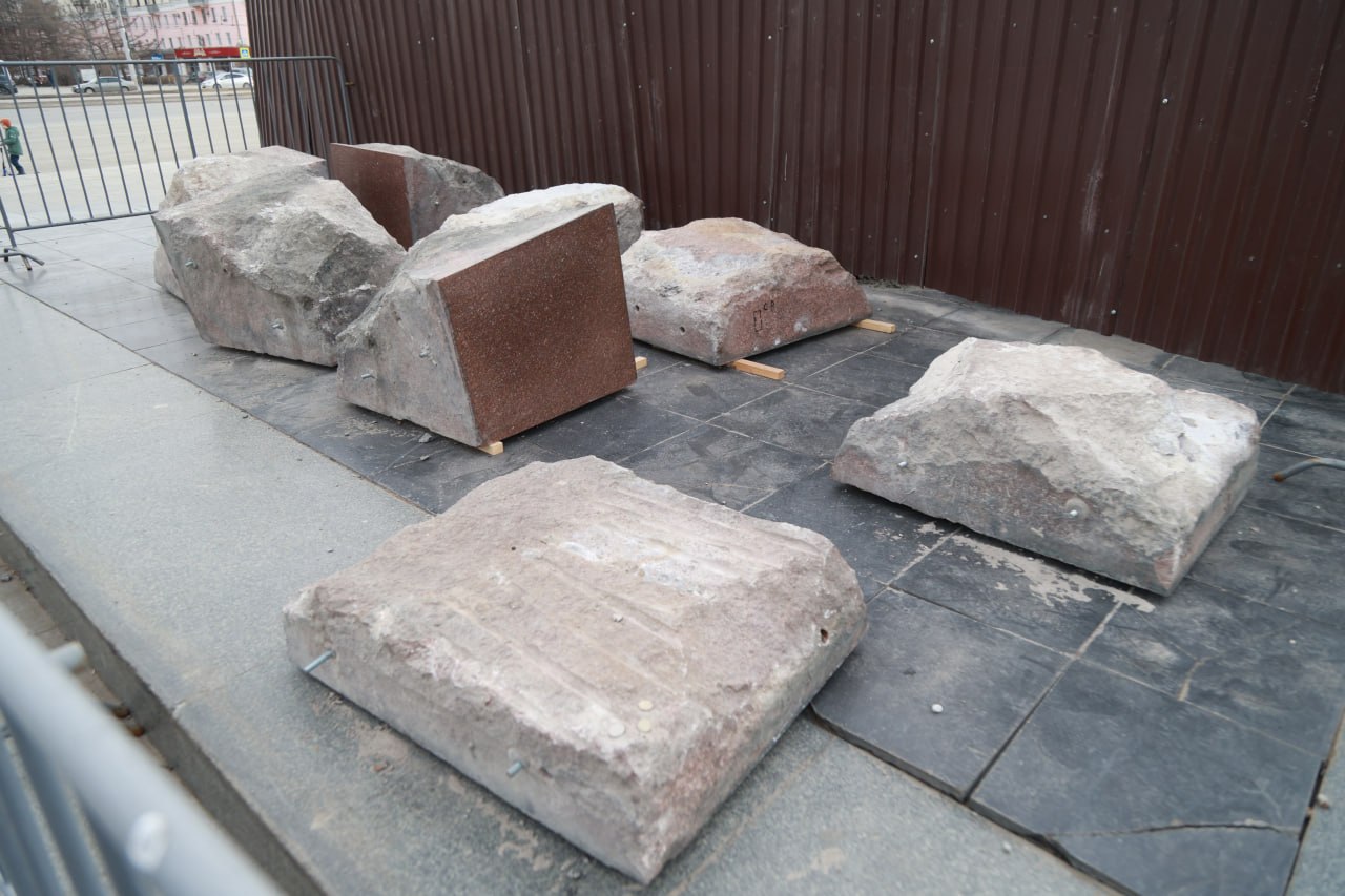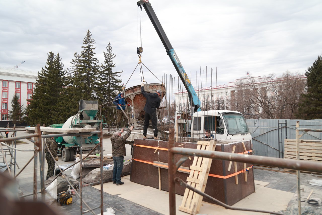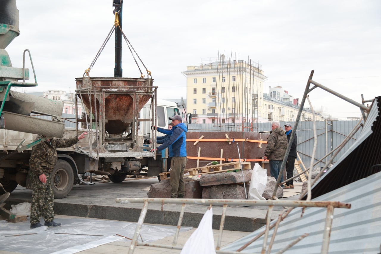 Скульптуру с площади вывозить не стали — сейчас она стоит рядом с местом работ, огражденная сеткой. На месте можно заметить бетономешалку и автокран. Фотограф Олег Укладов побывал на месте и запечатлел, как идут работы.