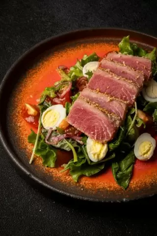 Тунец обжаривают до легкой корочки, внутри он остается сочным. Лук требует минимального привкуса горечи, поэтому его коротко замачивают в ледяной воде. Яйца варят и нарезают удобными кусочками, помидоры — четвертинками. Салатные листья ложатся основой, а сверху — ломтики тунца, луковые полукольца, яйца и четвертинки помидоров. Заправку взбивают до легкой эмульсии и соединяют все ???.