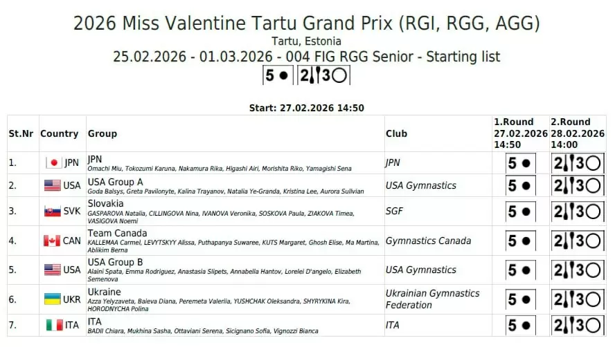 На Гран-при в Тарту ожидается участие выдающихся групповых команд, которые уже завоевали признание на международной арене. Среди них—сборная Японии, ставшая абсолютной чемпионкой мира в 2025 году. Также стоит отметить команду Украины, которая подтвердила свой статус, завоевав золото на Чемпионате мира в 2025 году в категории с мячами и обручами, а также серебро на Чемпионате Европы в том же виде.