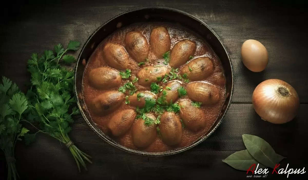 - Процесс: бланширование лука, подготовка начинки, формирование рулетиков, тушение.
