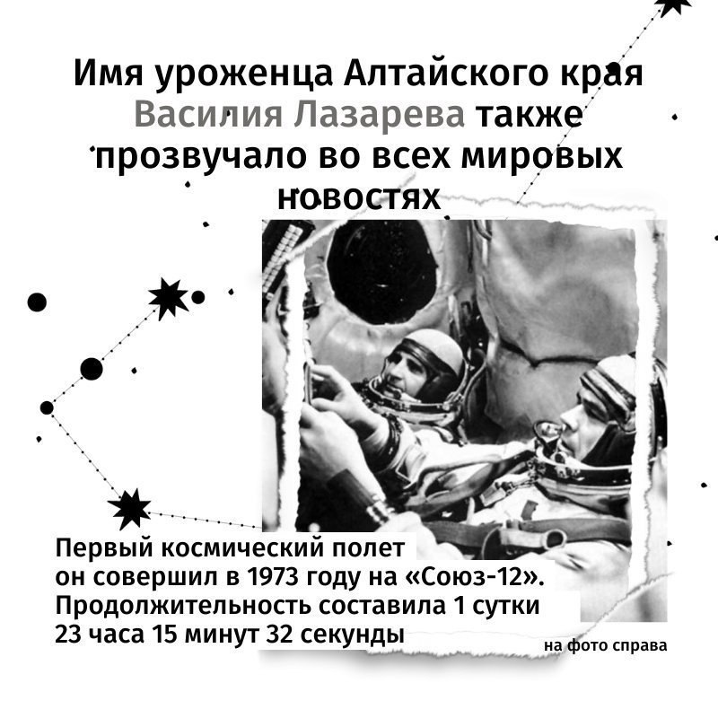 Завтра вся страна отметит день космонавтики. Алтайский край – регион по праву космический. Один из основоположников мировой космонавтики Юрий Кондратюк, второй космонавт планеты Герман Титов, член экипажей «Союз-12» и «Союз-17» Василий Лазарев – в...