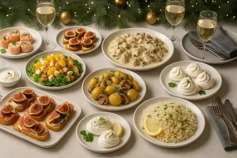 Праздничный стол может быть притягательным, разнообразным и при этом не занимать много времени на приготовление. Новогодние блюда в этом меню выглядят как из дорогого ресторана, но при этом остаются в рамках разумного бюджета. Меню, рассчитанное на 6 человек, можно создать всего за 1,5 часа, не дублируя банальные рецепты.