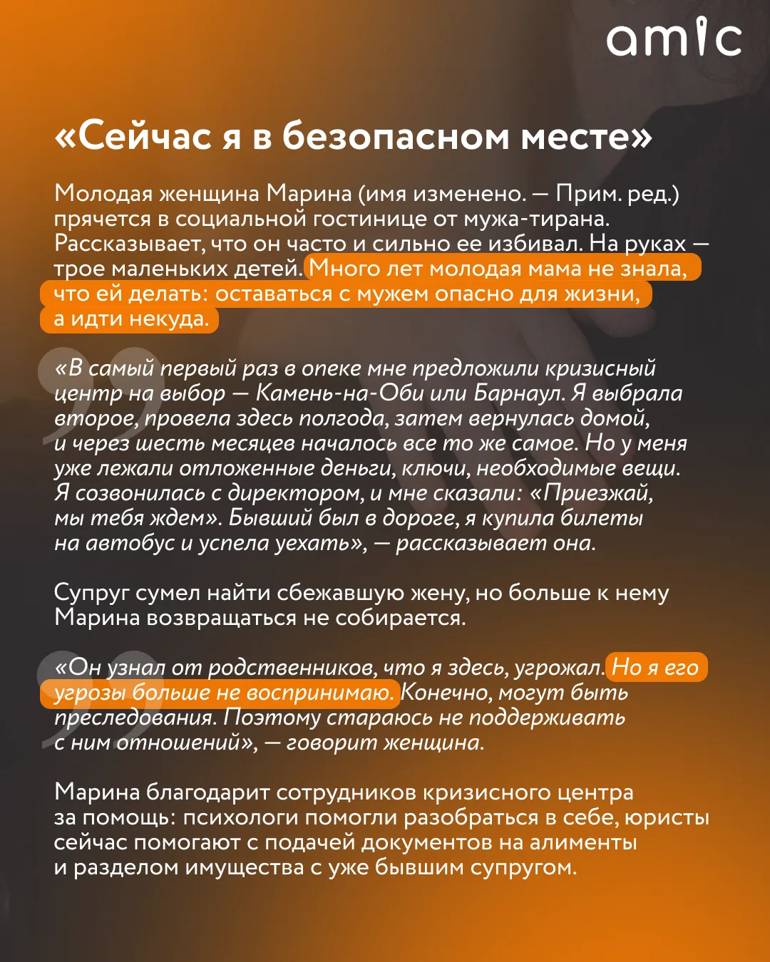 Это — Алтайский кризисный центр для женщин. Среди его подопечных — совсем разные люди, от состоявшихся бизнесвумен до школьниц, которые из-за беременности лишились поддержки близких. Их мужчины угрожают сотрудникам центра, притворяются курьерами и даже устраивают засады.