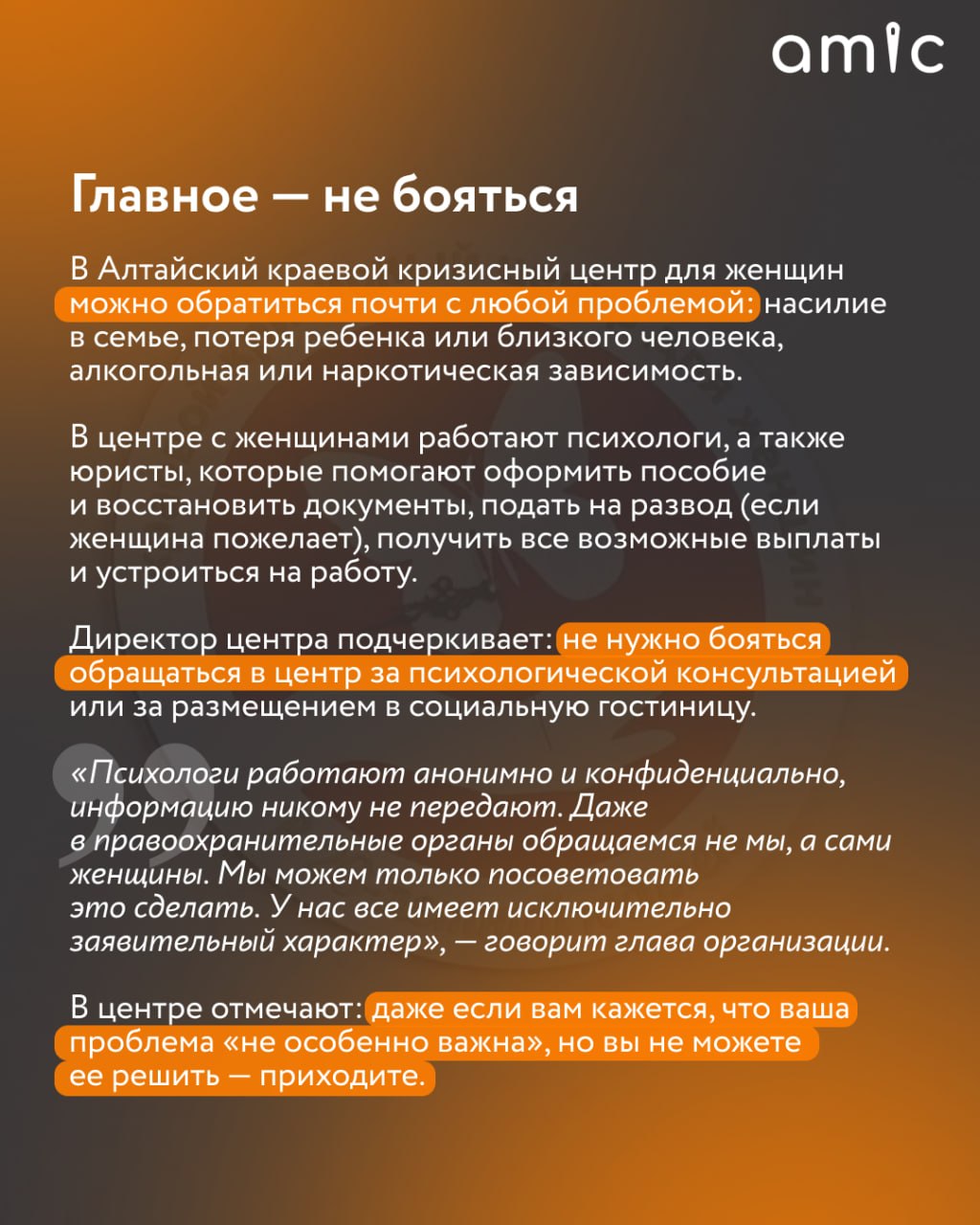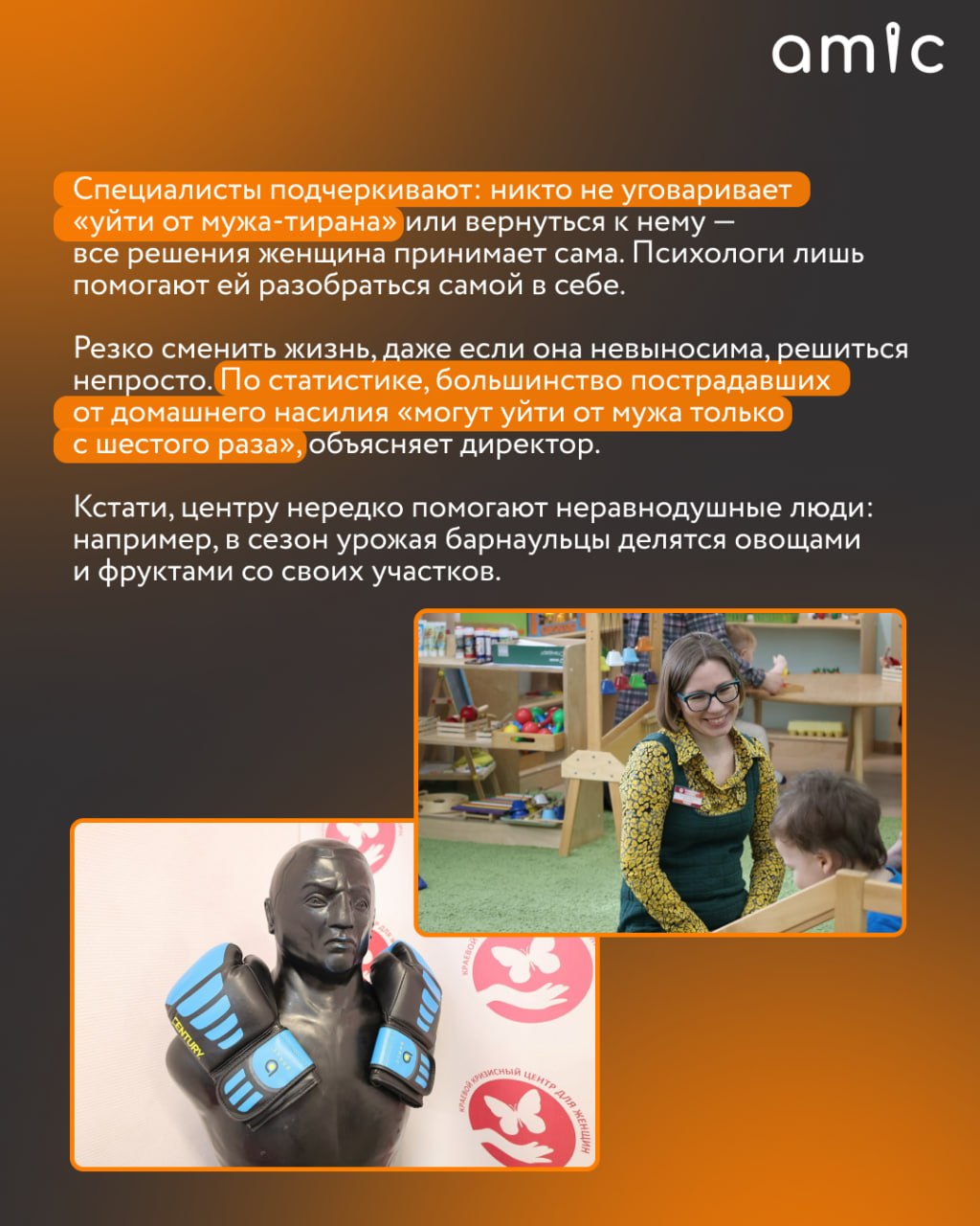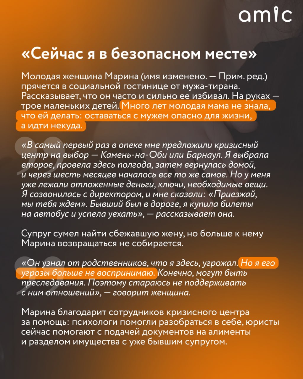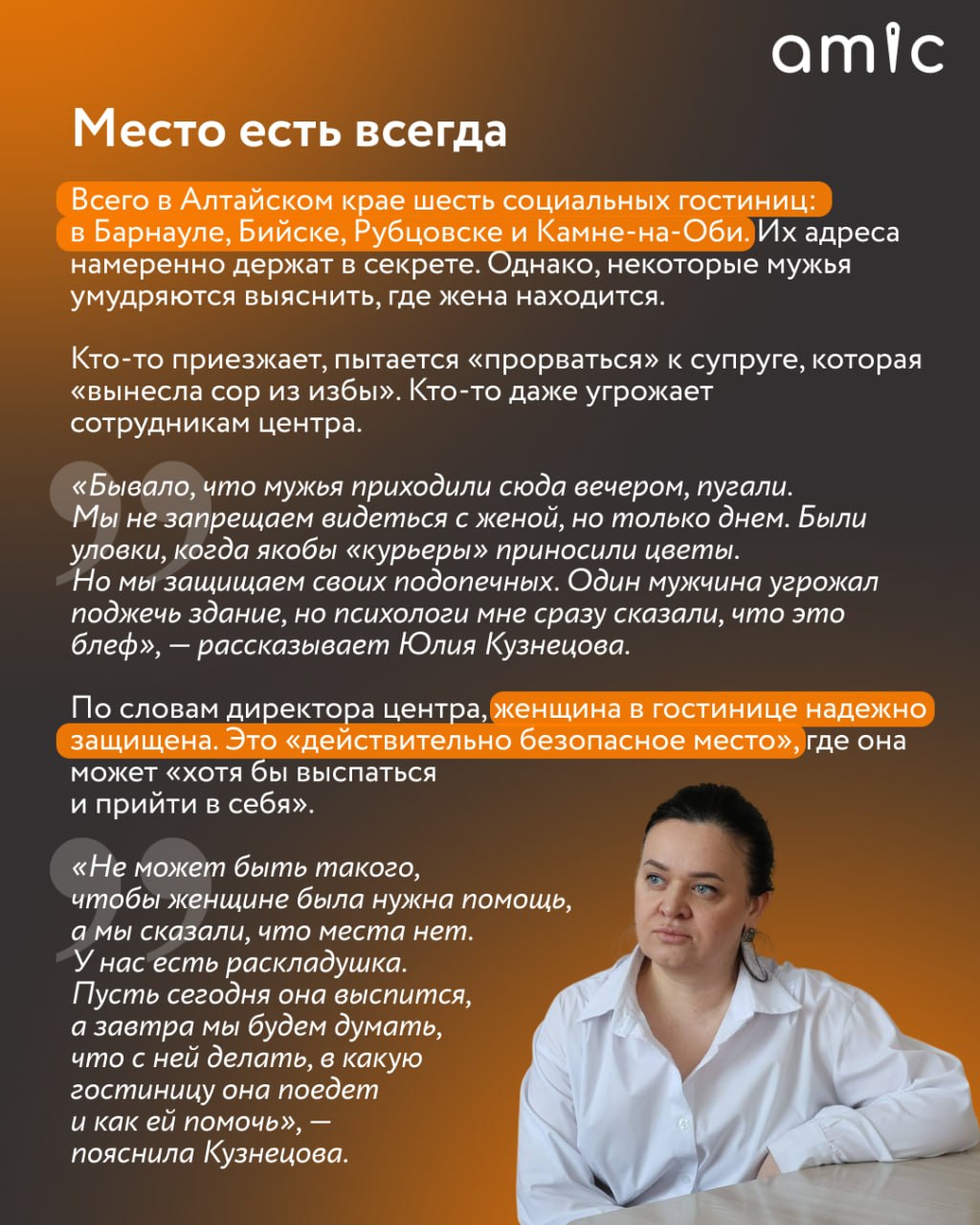 Это — Алтайский кризисный центр для женщин. Среди его подопечных — совсем разные люди, от состоявшихся бизнесвумен до школьниц, которые из-за беременности лишились поддержки близких. Их мужчины угрожают сотрудникам центра, притворяются курьерами и даже устраивают засады.