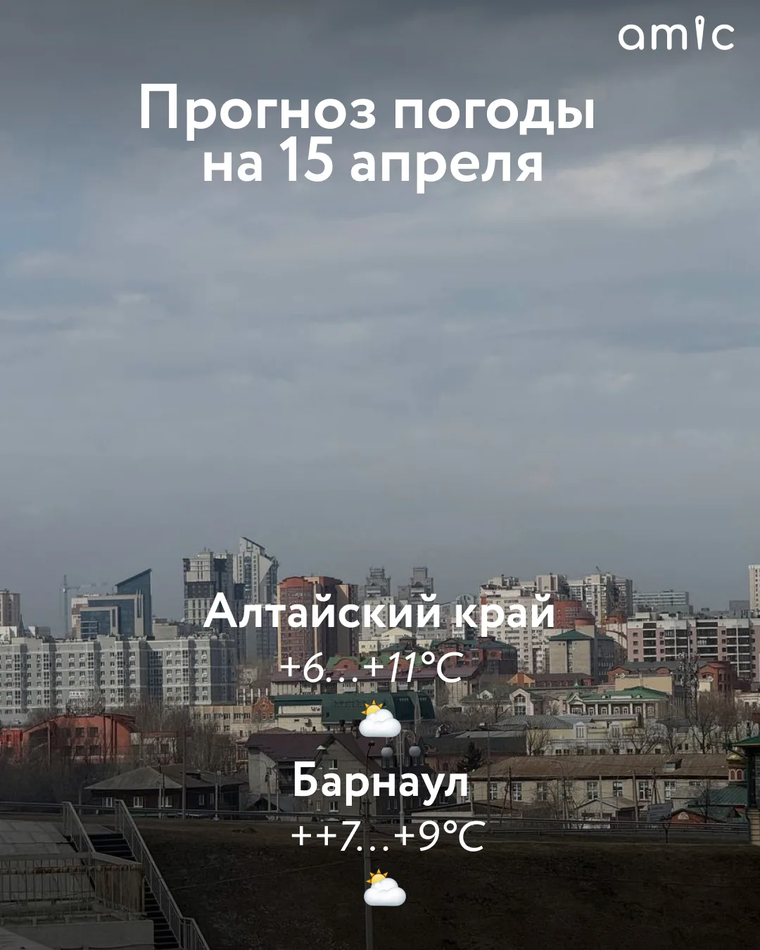 В Барнауле ожидается +7...+9 градусов. Преимущественно без осадков. В конце дня небольшой дождь и мокрый снег. Ветер южный с переходом на западный, 5–10 м/с.
