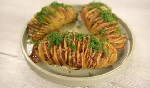 Приготовление картошки-гармошки требует всего 1 час 20 минут, а результат — это не только восхитительный гарнир, но и центральное блюдо на любом столе. Запеченная до хрустящей корочки, она становится настоящим кулинарным произведением благодаря тонким полоскам бекона и богатству ароматных трав. Это блюдо прекрасно подходит как для праздничного угощения, так и для домашнего ужина в кругу семьи.