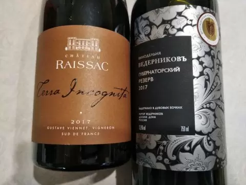 На дегустации представлены два потрясающих вина 2017 года - «Ведерниковъ. Губернаторский резерв» и Chateau Raissac Terra Incognita. Обе бутылки вскрыты с намерением насладиться их вкусом без лишних переживаний о хранении.