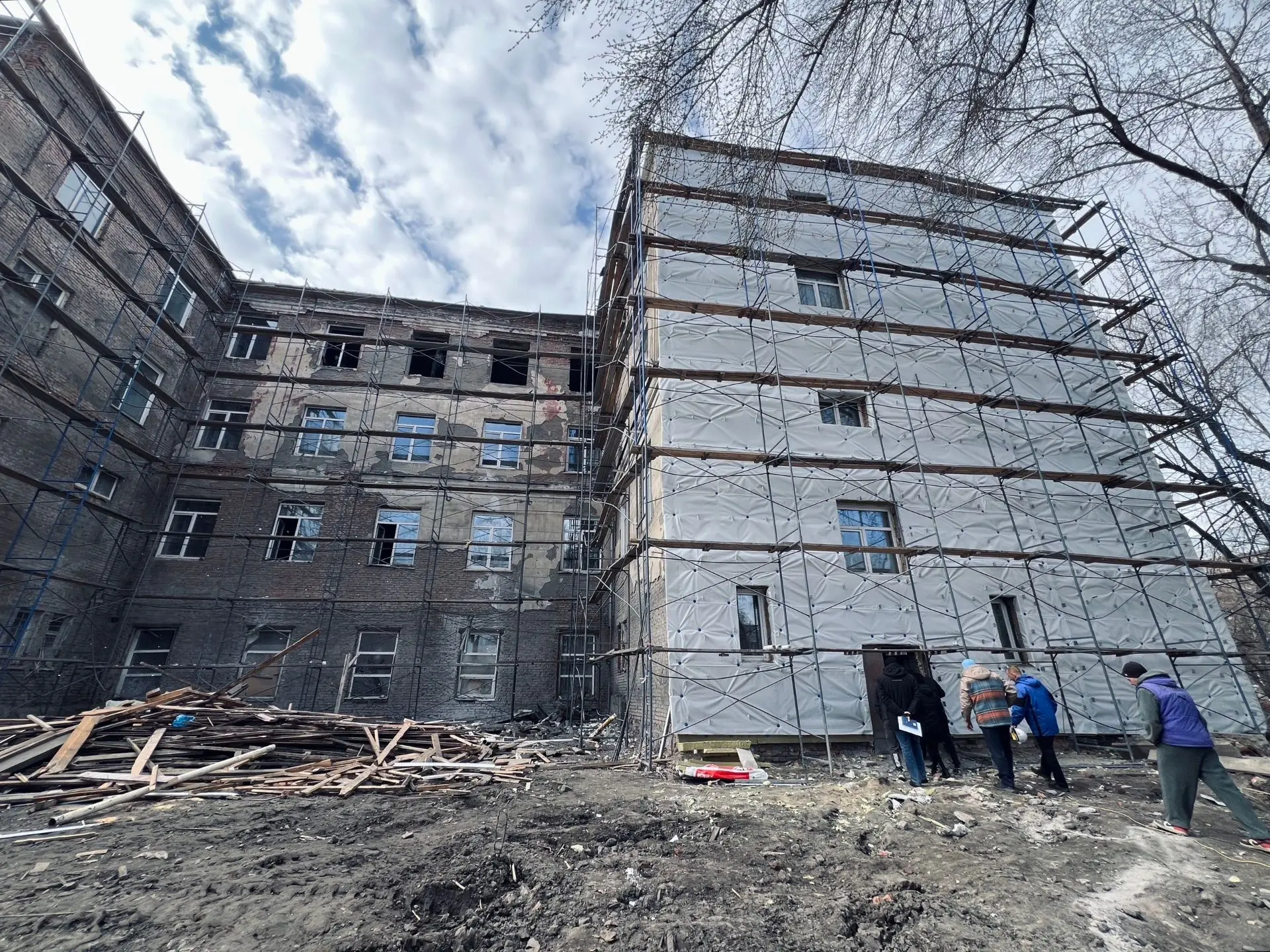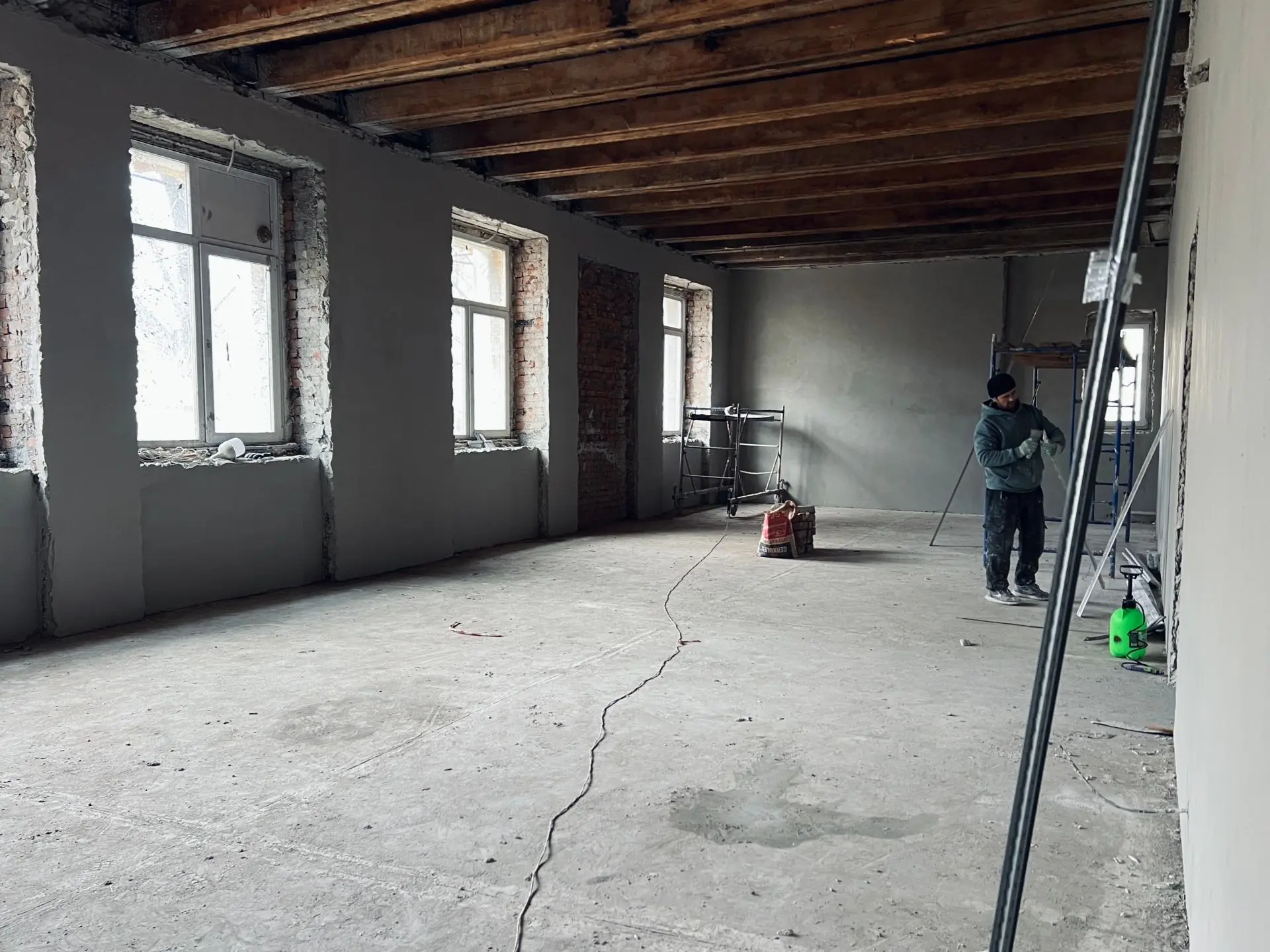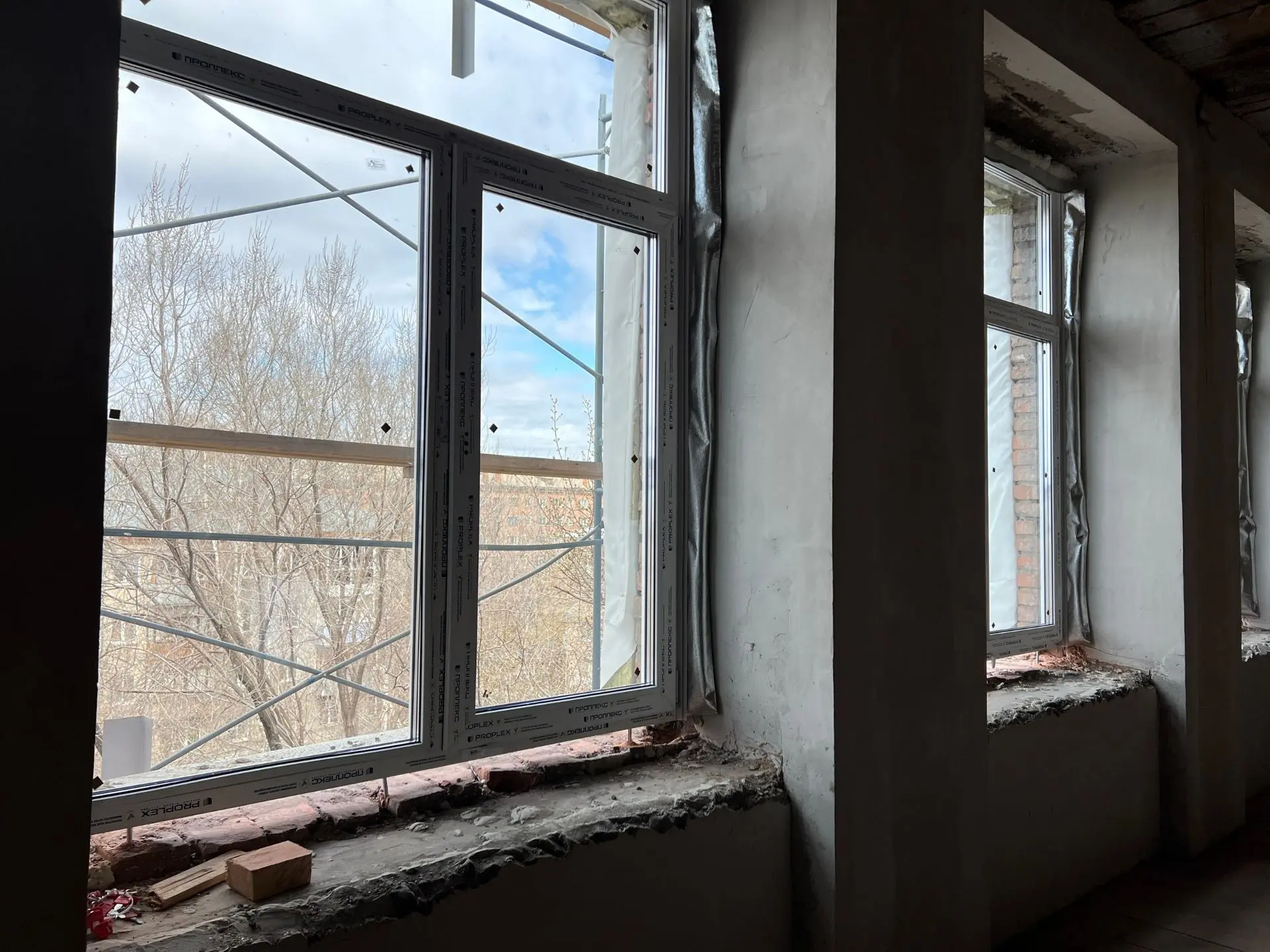 На первом этаже выполняется черновое оштукатуривание стен. На верхних этажах устанавливают новые стеклопакеты. Продолжается демонтаж межэтажных перекрытий. В ряде помещений подготовка напольных оснований уже завершена, в остальных — ведётся.