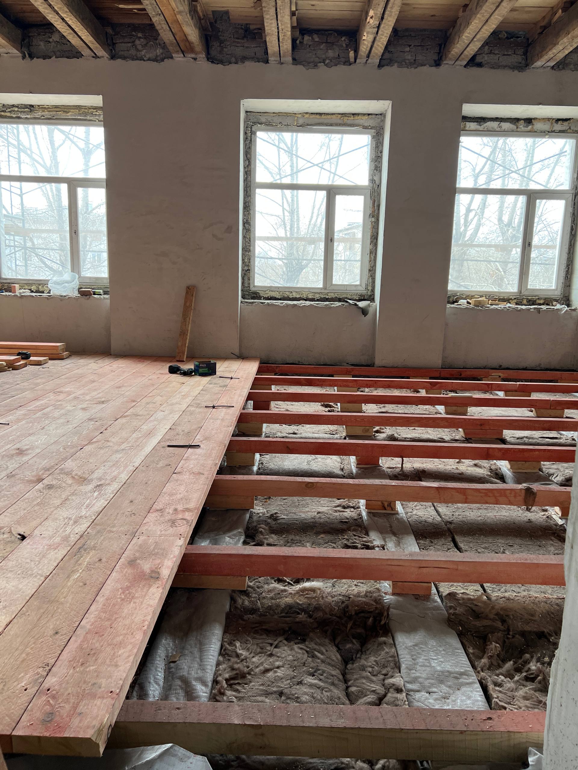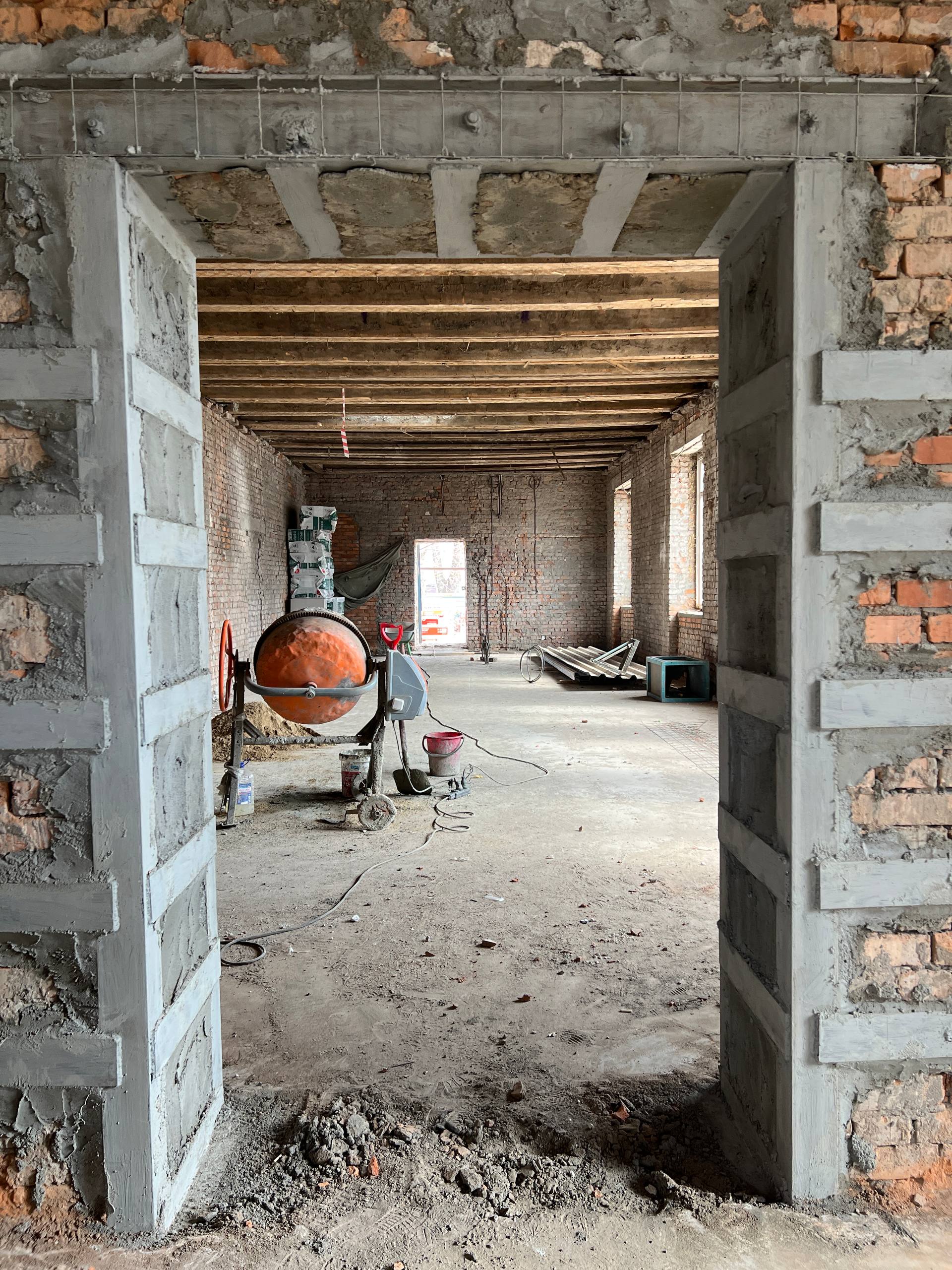 Внутри здания: на первом этаже выполняют черновое оштукатуривание стен. На верхних этажах начали устанавливать новые стеклопакеты. Продолжается демонтаж межэтажных перекрытий. В помещениях ведётся подготовка напольных оснований, а в некоторых они уже готовы.