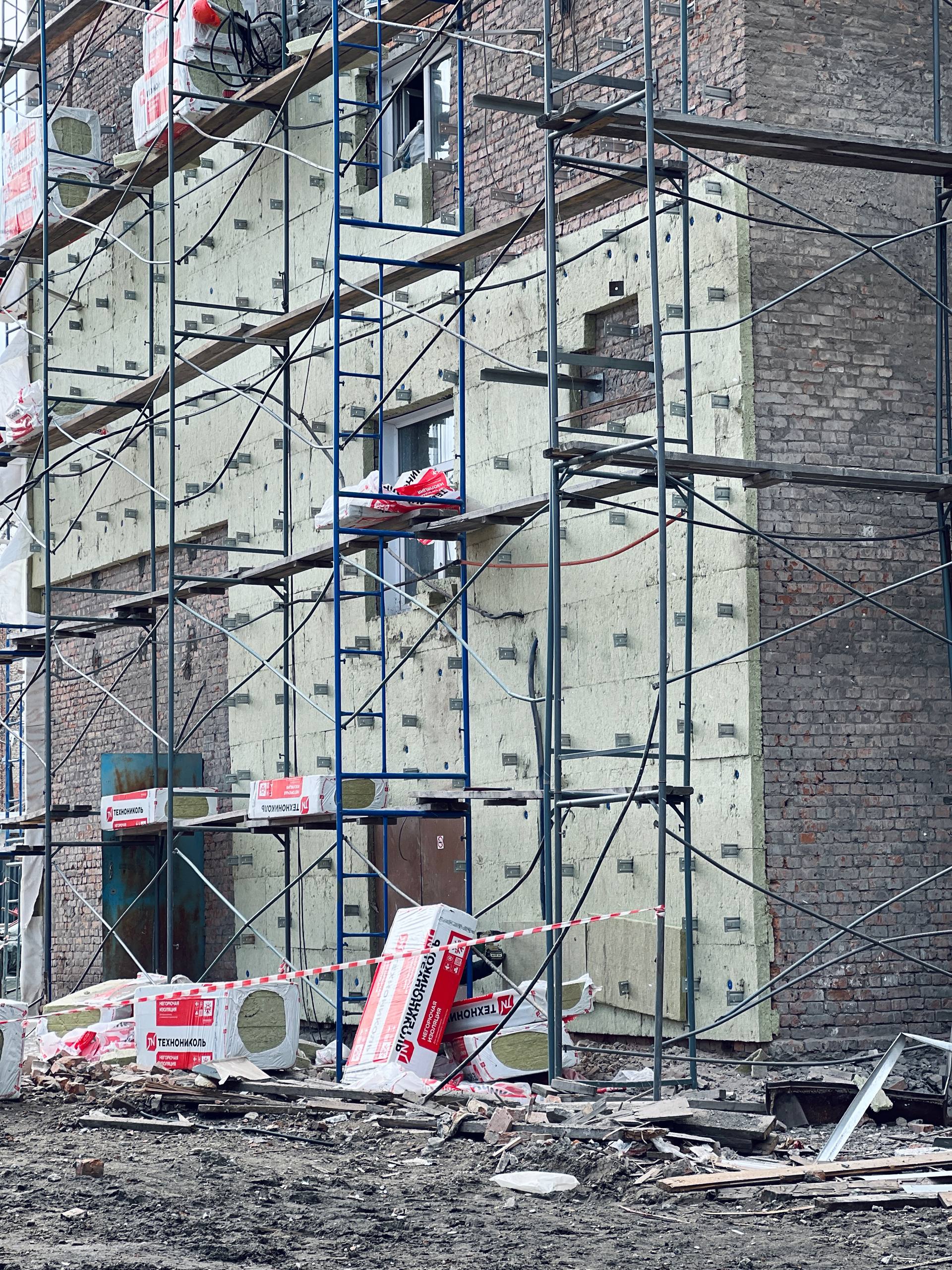 По фасаду: на северной стене здания начали монтировать утеплитель и ветровлагозащитный материал. Работы идут в очень хорошем темпе.