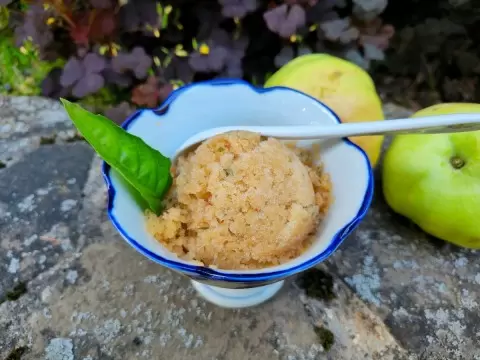 - Кислотность получилась на высоком уровне: кислые яблоки и лимон сделали сорбет довольно кислым, а количество сахара не смогло это компенсировать.