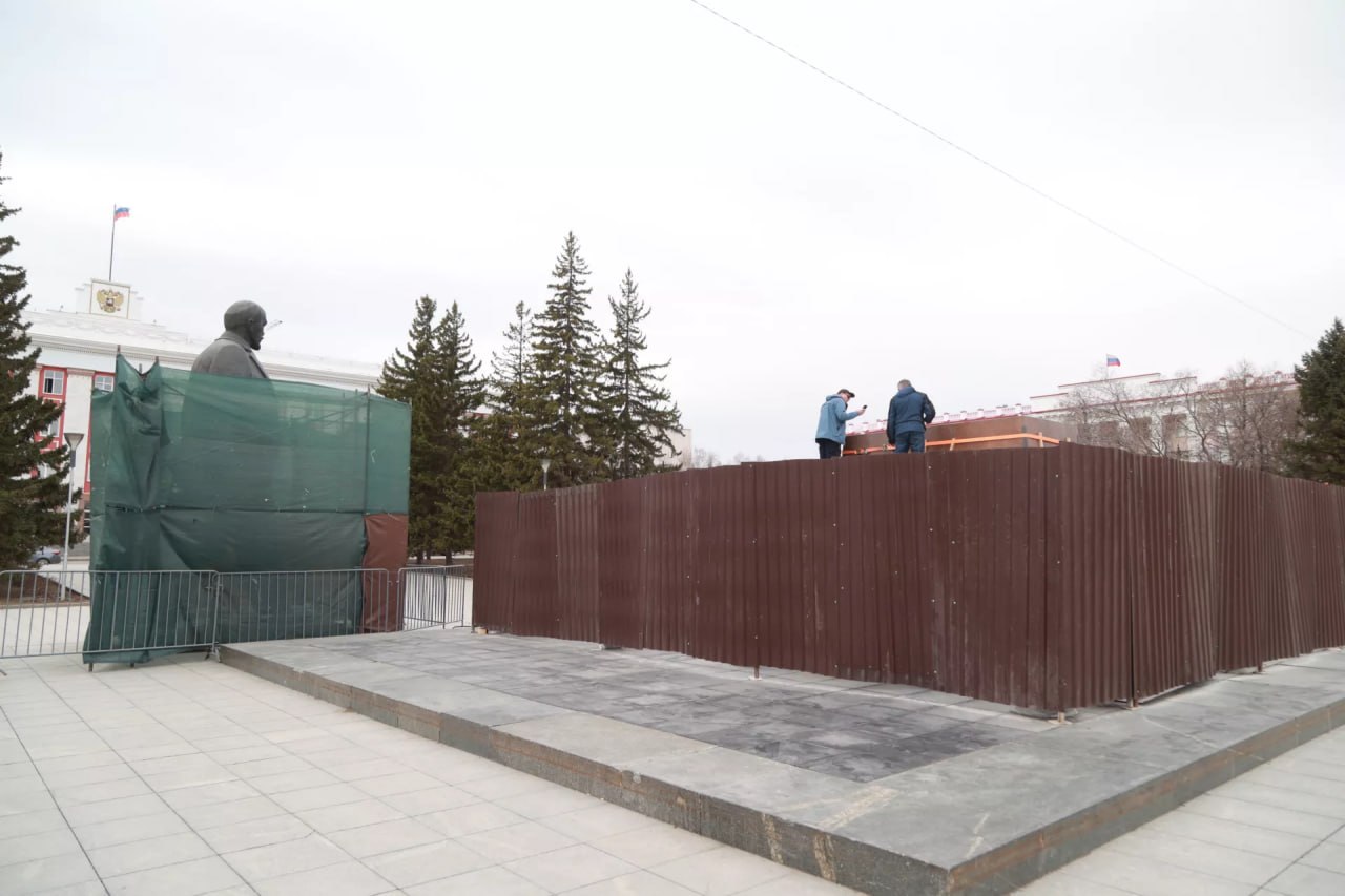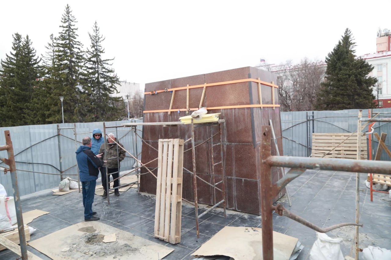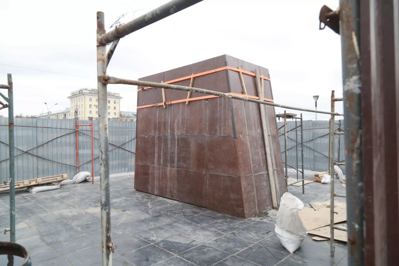 На объекте находятся рабочие, однако строительной техники уже нет. На данный момент постамент уже выглядит собранным. Подрядчик должен завершить реставрацию уже к 17 апреля.