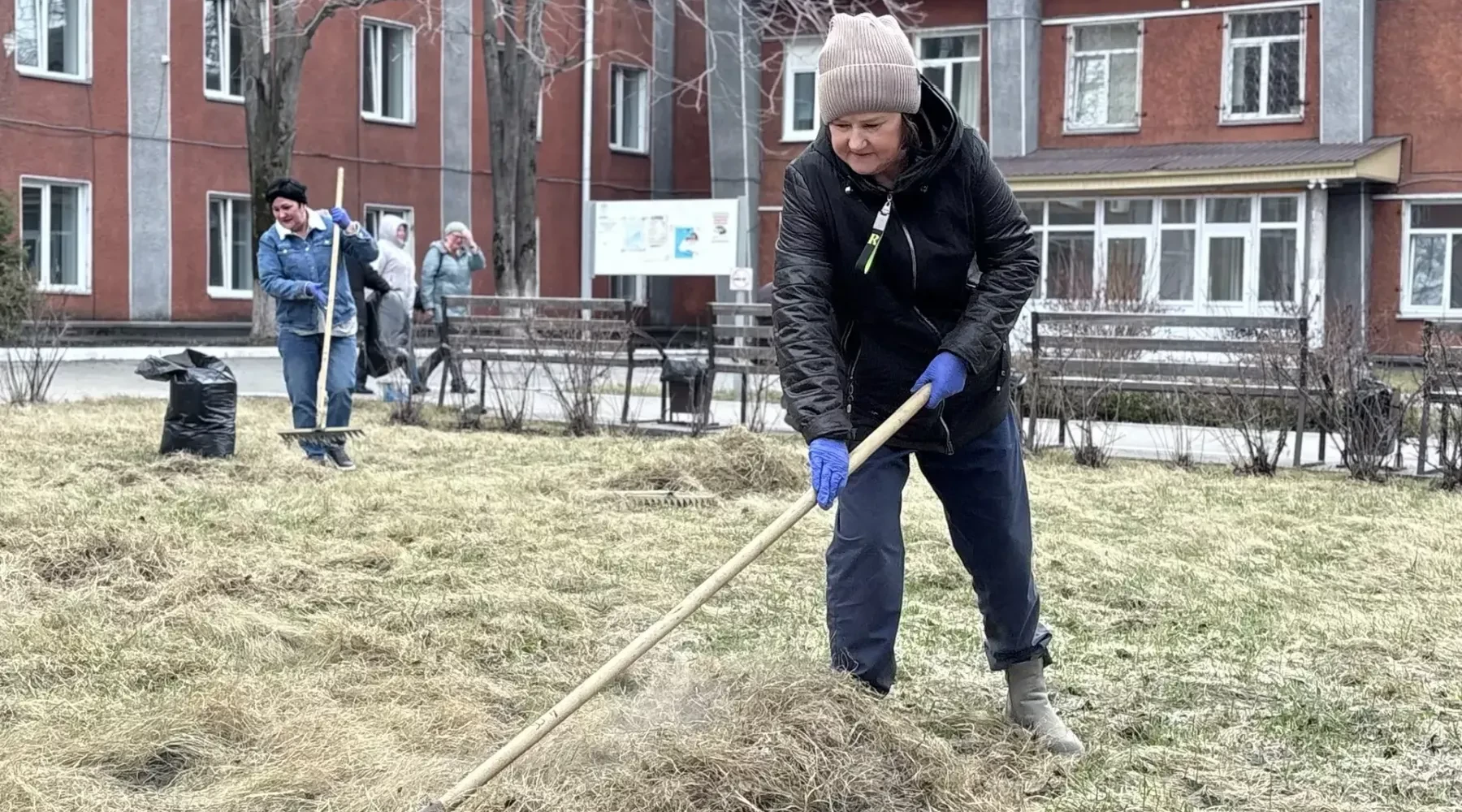 Вооружившись инвентарём, врачи и медсёстры наводили чистоту и порядок. Одни убирали опавшую листву, другие подметали тротуары, а третьи красили бордюры. Благодаря их усилиям было собрано множество мешков с мусором, и территория заметно преобразилась.