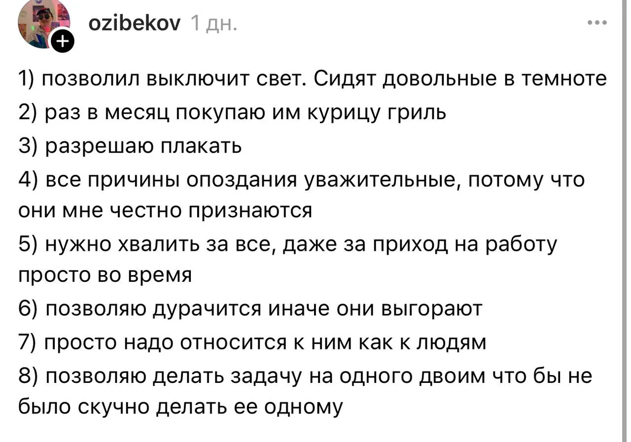 "Разрешаю плакать". Пользователь соцсети Threads* рассказал, как ему удается эффективно работать с зумерами.