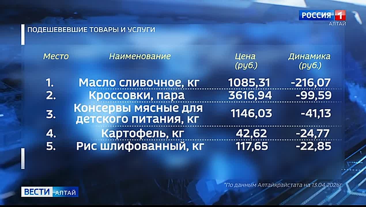 Сначала - пятёрка наиболее подешевевших товаров. На первом месте сливочное масло, оно утратило в цене свыше 216 рублей, в прошлом году весной на него был ажиотаж. Дешевле на 100 рублей стали кроссовки. На третьем месте мясные консервы для детского питания – минус 41 рубль. Картофель в крае тоже подешевел - почти на 25 рублей. Стал за год дешевле и рис.
