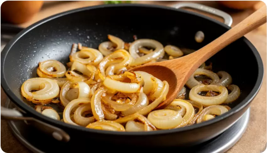 Однако прочные клеточные стенки лука затрудняют высвобождение соков, что делает процесс достаточно длительным. Обычно жарка занимает от 30 до 40 минут, что объективно не зависит от мастерства повара.