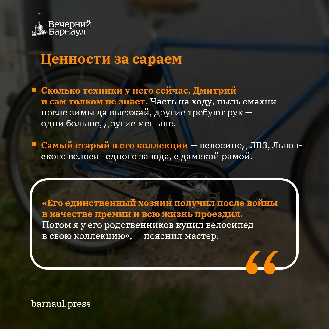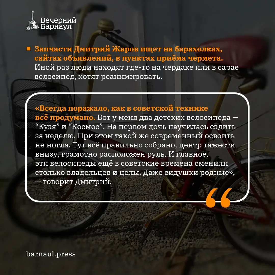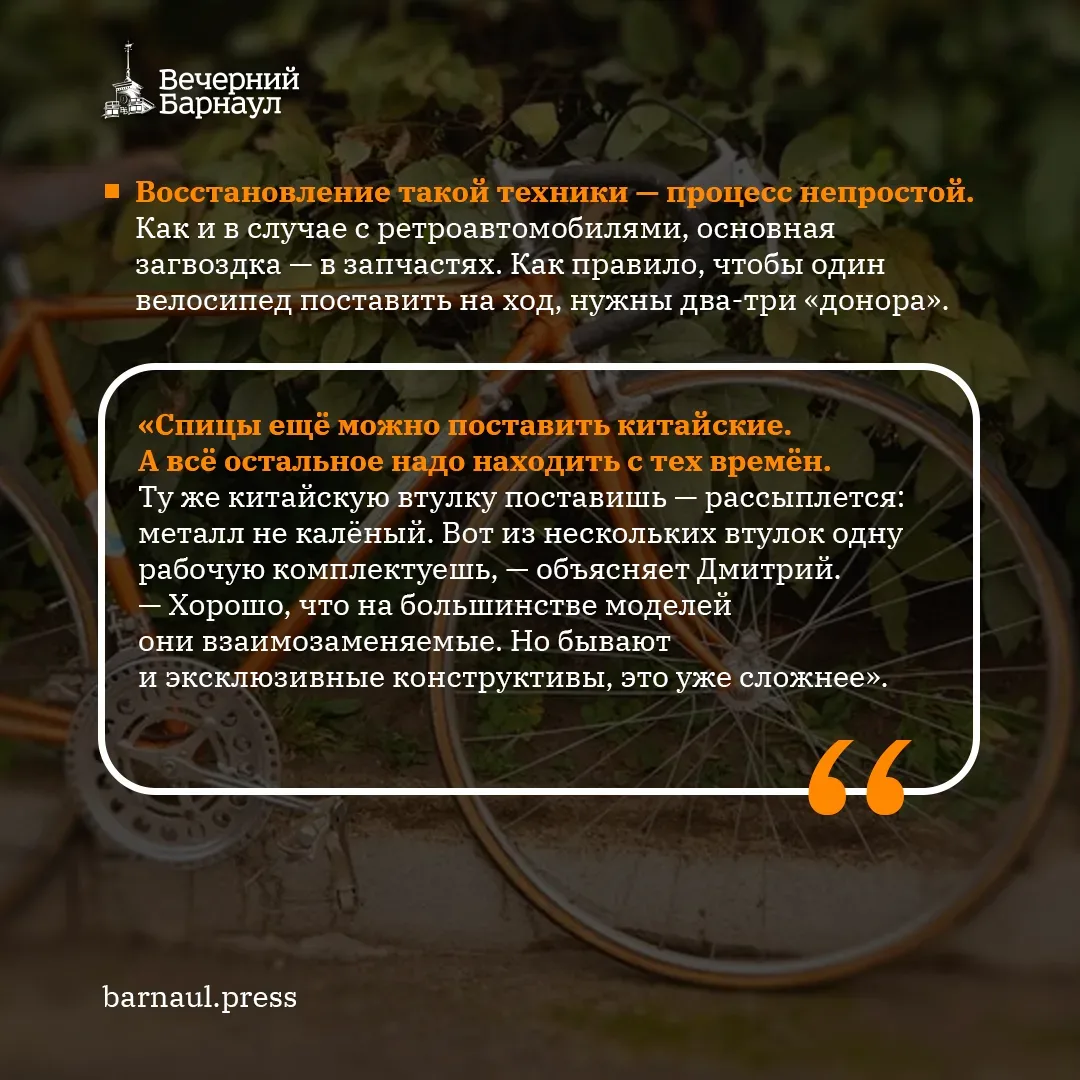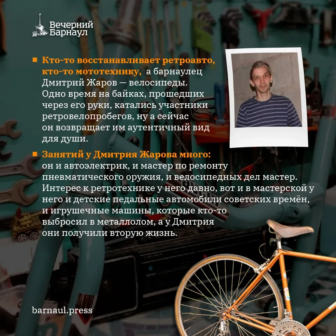 Кто-то восстанавливает ретроавтомобили, кто-то мототехнику, а Дмитрий Жаров — велосипеды. Одно время на байках, прошедших через его руки, катались участники ретровелопробегов, ну а сейчас он возвращает им аутентичный вид для души.