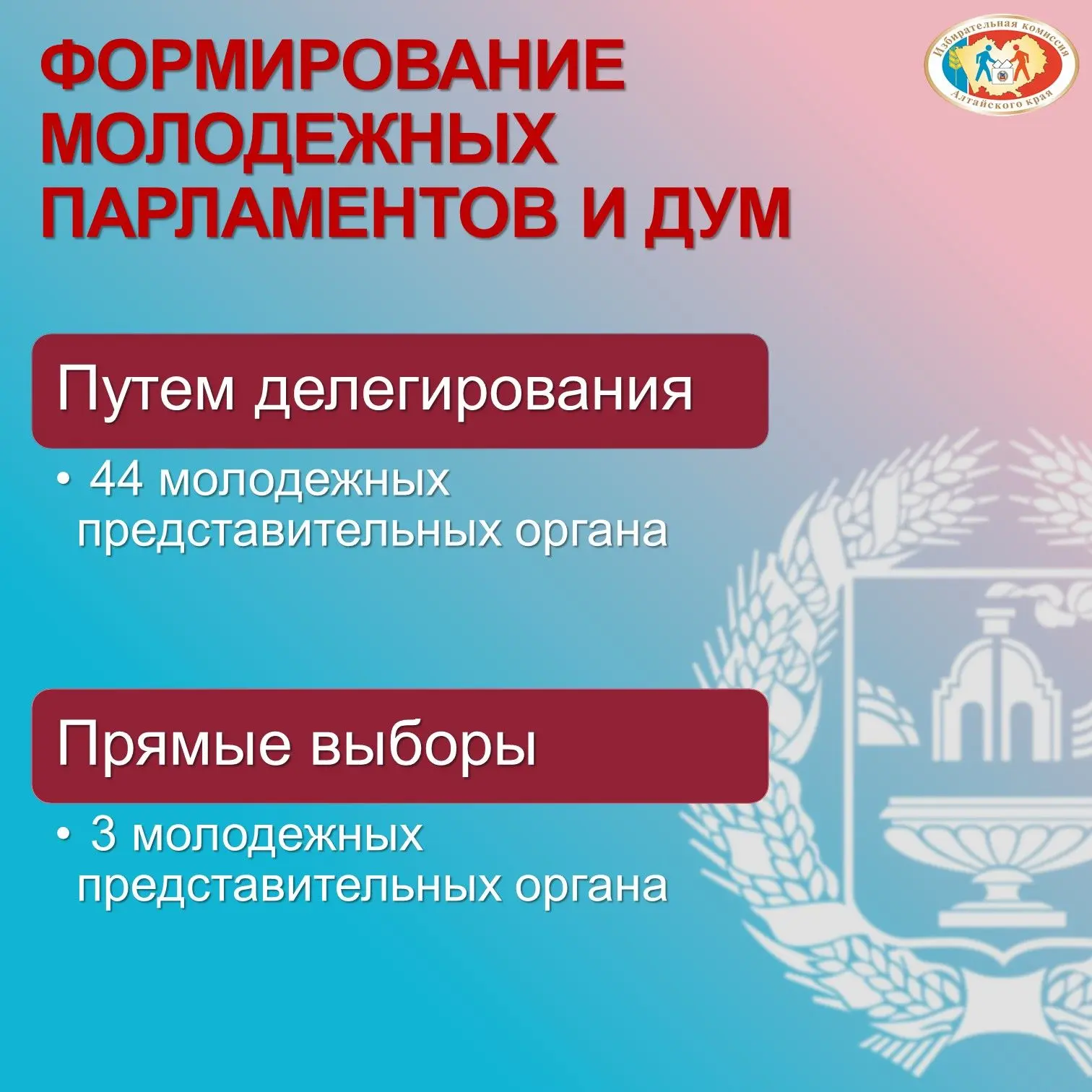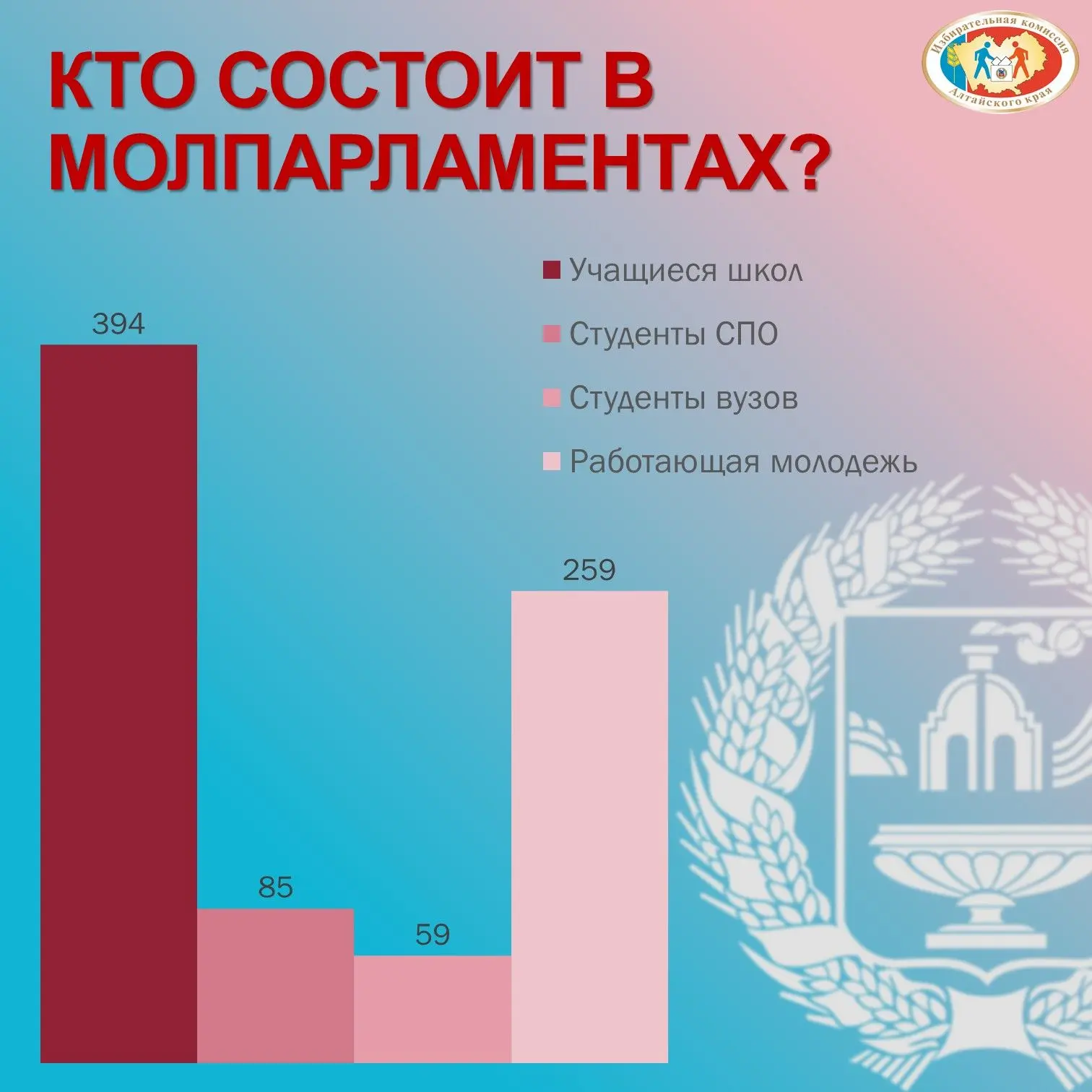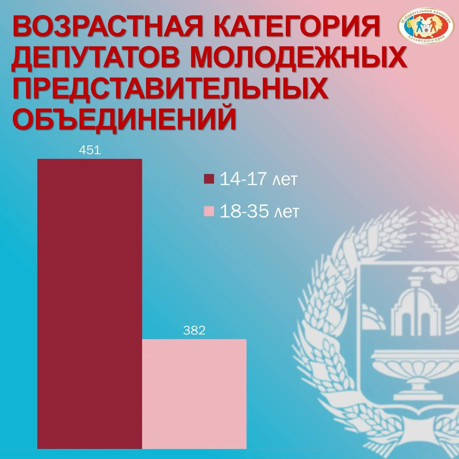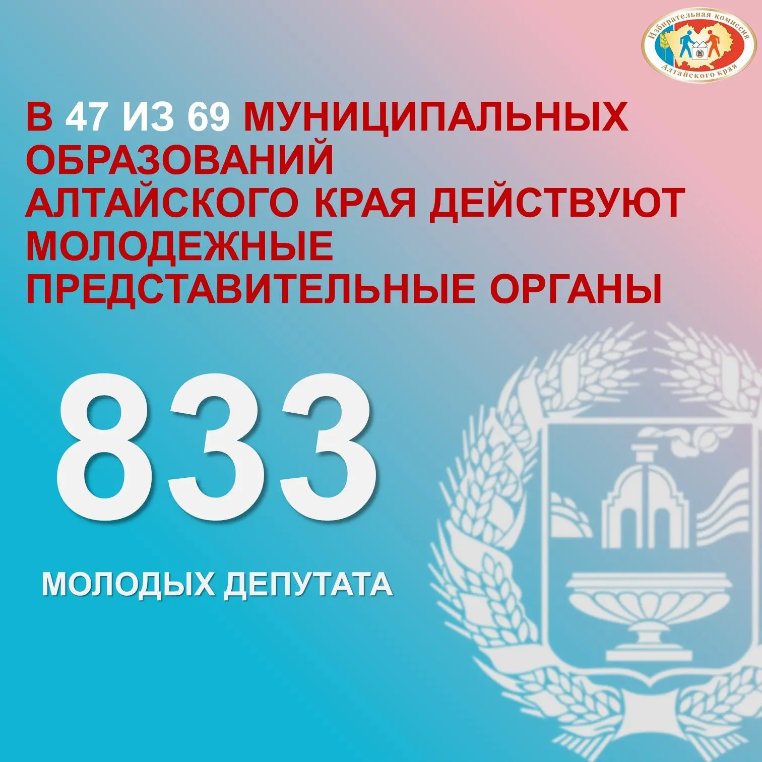 Мы подсчитали! Молодёжные представительные органы, в числе которых молодёжные парламенты и думы, представлены в 47 муниципалитетах Алтайского края. В общей сложности членство в объединениях осуществляют 833 депутата; большинство из них - это учащиеся школ, студенты высшего и среднего образования, а также работающая молодёжь от 14 до 35 лет.