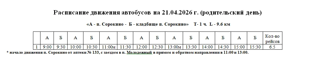 Также будет организован маршрут от п. Сорокино до кладбища в п. Сорокино.
