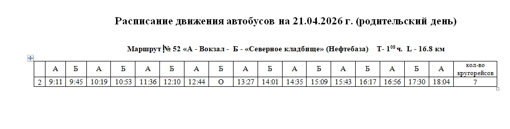 Уважаемые пассажиры 21 апреля 2026 года движение до Северного кладбища будет осуществляться по автобусному маршруту № 52 с 09:00 до 18:00.