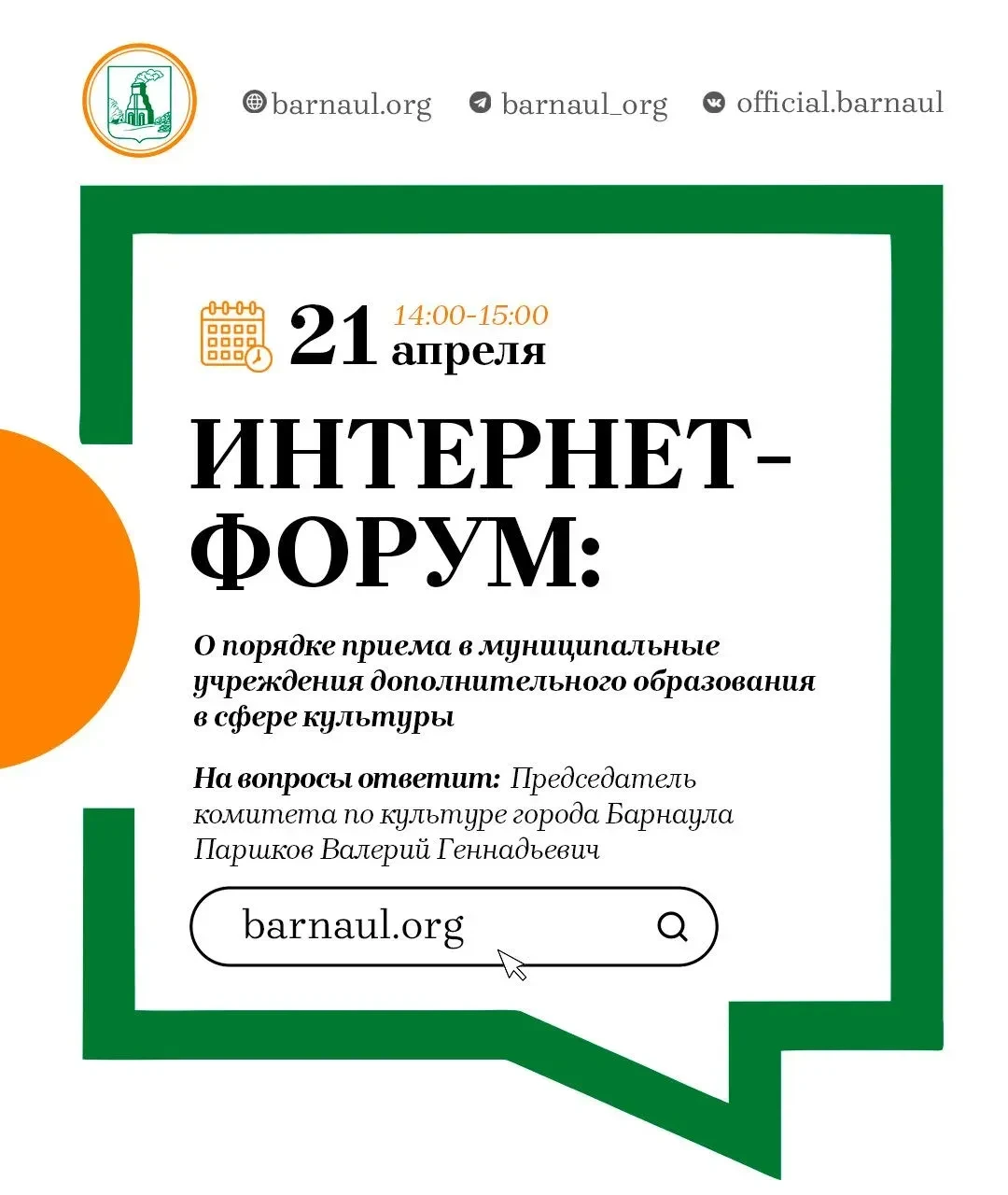 Сегодня, 21 апреля, с 14.00 до 15.00 на официальном интернет-сайте города Барнаула пройдет интернет-форум.