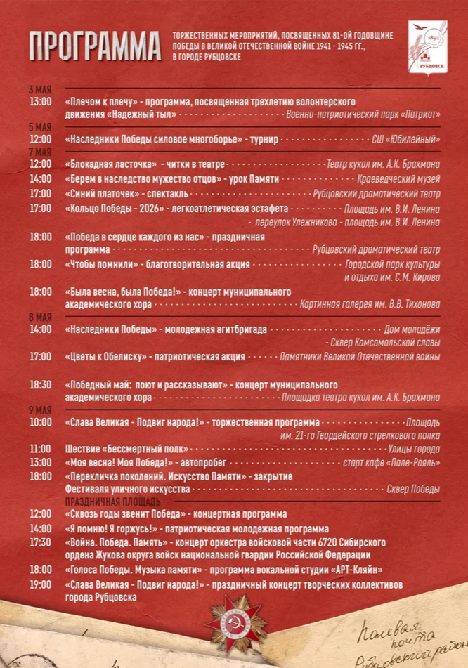 Уважаемые рубцовчане и гости нашего города! Приглашаем вас принять участие в торжественных мероприятиях, посвящённых 81-ой годовщине Победы в Великой Отечественной войне 1941–1945 годов.
