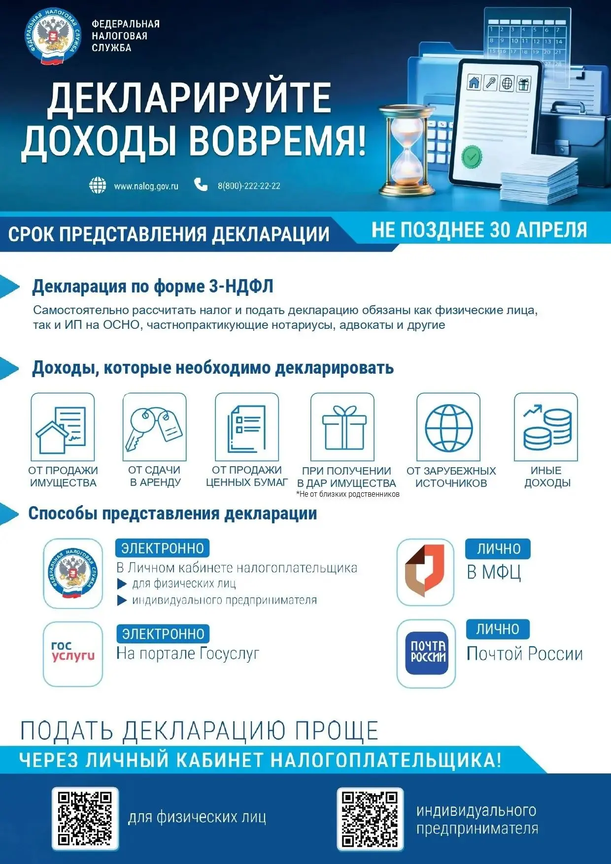 Представить декларацию о доходах, полученных в 2025 году, необходимо не позднее 30 апреля 2026 года.