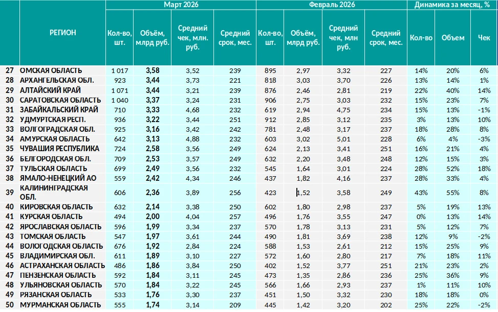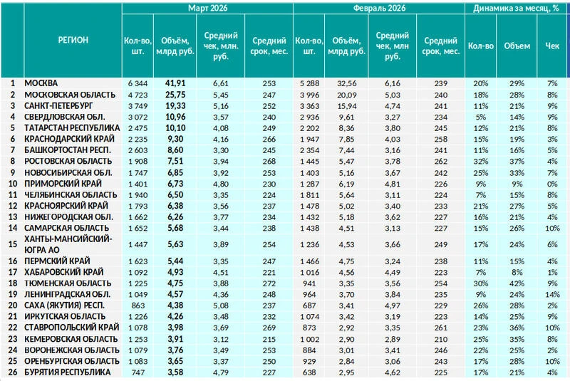Алтайский край занял 29 место в рейтинге регионов России по ипотечному кредитованию в марте и I квартале 2026 года, сообщает Объединенное Кредитное Бюро (ОКБ).