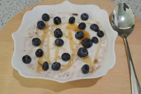 Собрать все необходимые компоненты для рецепта.Промыть овсяные хлопья под холодной водой, чтобы убрать лишний крахмал.Переложить промытые хлопья в подходящую емкость для смешивания.Очистить банан и нарезать его крупными кусочками, затем добавить к овсянке.Очистить грецкие орехи, мелко нарезать и добавить в смесь.Влить в емкость 200 грамм йогурта и аккуратно перемешать ингредиенты до равномерного распределения.Накрыть емкость пленкой или крышкой и оставить в холодильнике на ночь для пропитки.Утром достать овсянку из холодильника и снять пленку, после этого добавить 1 чайную ложку меда и 25 грамм голубики.По желанию, оставить овсянку на 15-20 минут при комнатной температуре перед подачей для легкого нагрева.Этот ненавязчивый, но при этом эффектный завтрак идеально сочетает в себе сладость бананов, нежность йогурта и хруст орехов. Это не только полезно, но и невероятно вкусно!