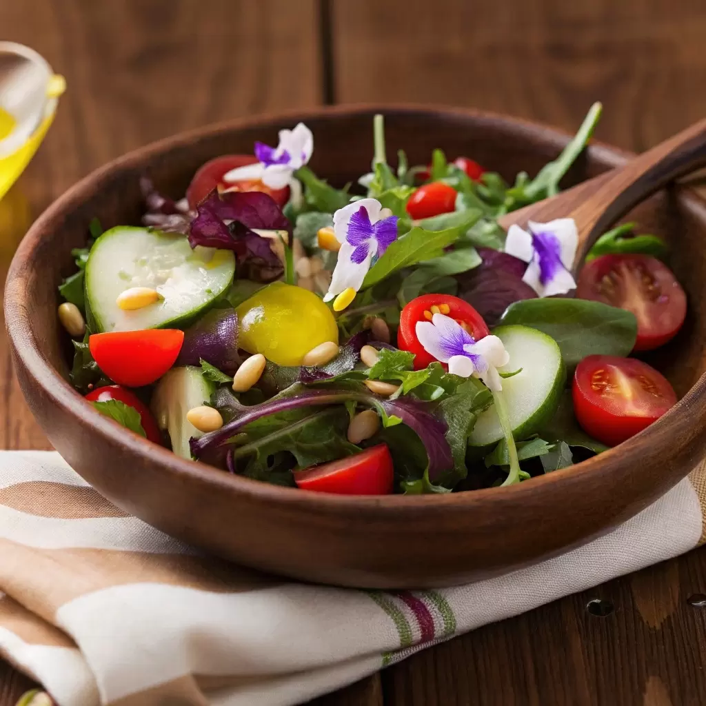 - Салат с фиалками и рукколой: Этот легкий и ароматный салат станет отличным началом дня. Свежая руккола, листья салата, съедобные фиалки и томаты создают идеальное сочетание для весеннего утра.