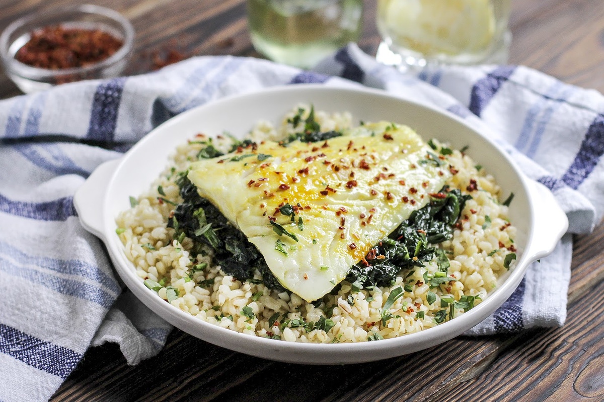 Теперь на тарелки аккуратно выложить булгур, сверху расположить шпинат и треску. Это вкусное и полезное блюдо готово к подаче. Приятного аппетита!