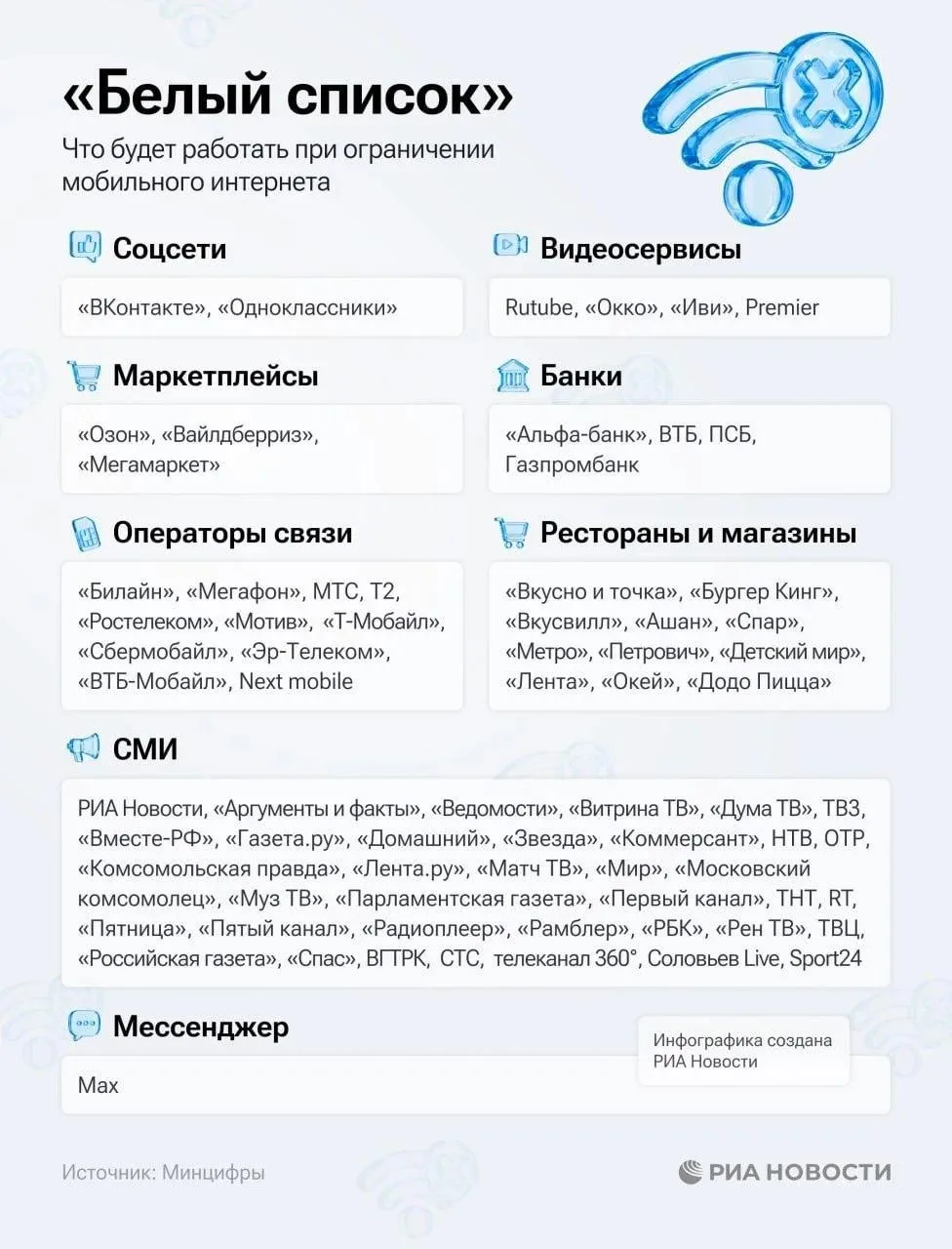 Ранее в «белый список» уже вошли соцсети, национальный мессенджер Max, маркетплейсы, супермаркеты, видеосервисы, личные кабинеты операторов связи. Затем был обеспечен доступ к Госуслугам, платформе для дистанционного голосования, сайтам Президента и Правительства РФ.